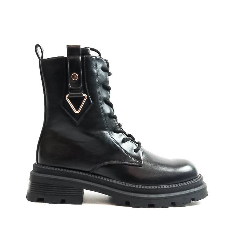 | Αρβυλάκι τρακτερωτό με κορδόνια και διακοσμητικό στοιχείο στο πλάϊ, από οικολογικό δέρμα. Κλείνει με φερμουάρ στο πλάι. Έχει αντιολισθητική σόλα και το ύψος του είναι 5 εκ. |