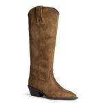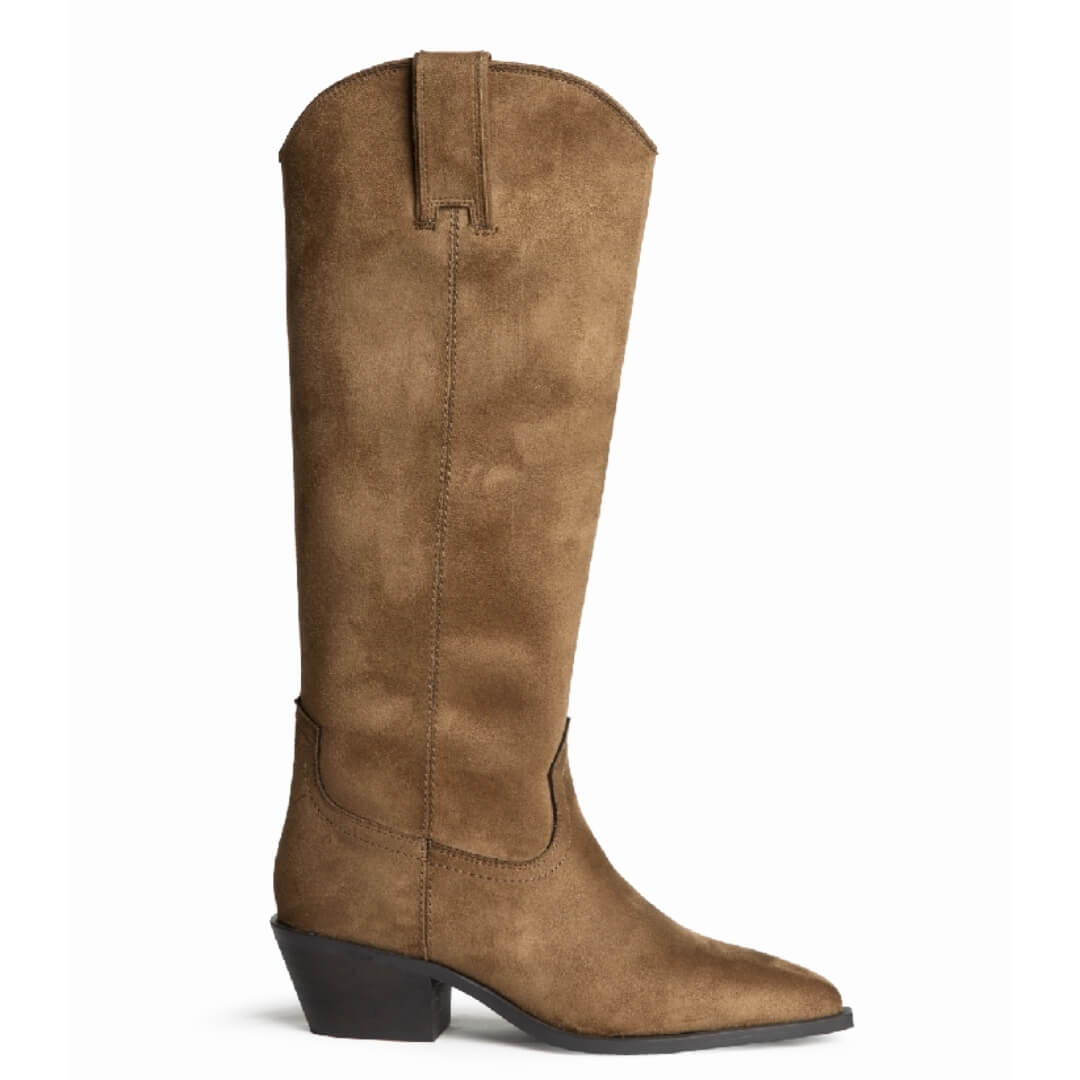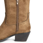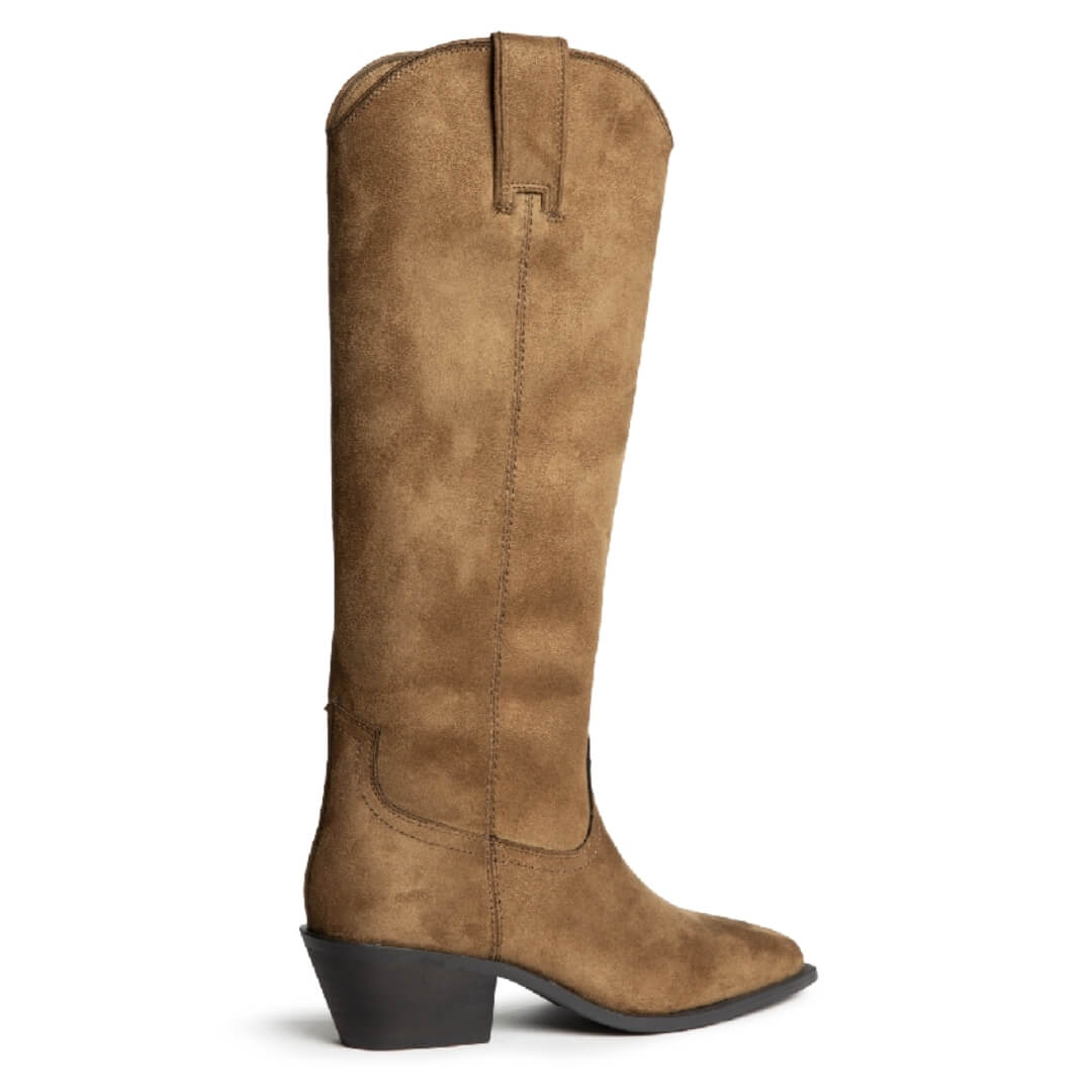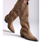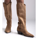 Μπότα cowboy, μέχρι το γόνατο, από οικολογικό δέρμα σε σουέτ υφή. Έχει εξώραφες λεπτομέρειες και θηλιές στο πάνω μέρος. Μυτερό τελείωμα. Κλείνει με φερμουάρ στην εσωτερική πλευρά. Το ύψος του τακουνιού είναι  4,5 εκ.