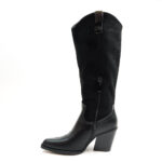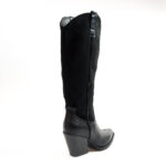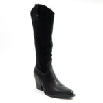 | Μπότα cowboy, μέχρι το γόνατο, από οικολογικό δέρμα σε συνδυασμό με σουέτ. Έχει εξώραφες λεπτομέρειες και θηλιές στο πάνω μέρος. Μυτερό τελείωμα. Κλείνει με φερμουάρ στην εσωτερική πλευρά. Το ύψος του τακουνιού είναι 7 εκ. |