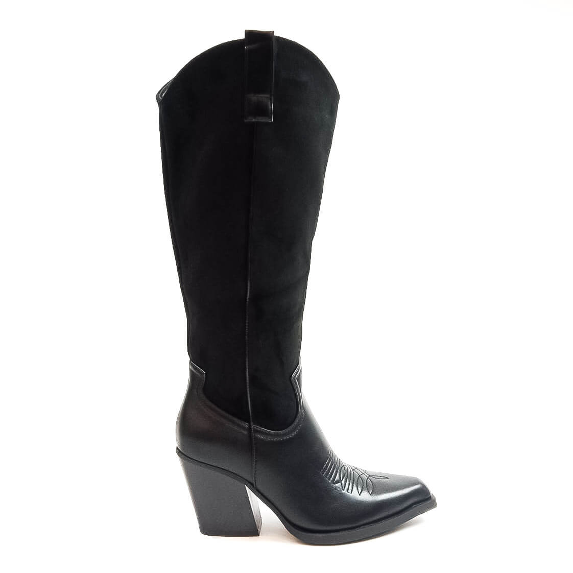 | Μπότα cowboy, μέχρι το γόνατο, από οικολογικό δέρμα σε συνδυασμό με σουέτ. Έχει εξώραφες λεπτομέρειες και θηλιές στο πάνω μέρος. Μυτερό τελείωμα. Κλείνει με φερμουάρ στην εσωτερική πλευρά. Το ύψος του τακουνιού είναι 7 εκ. |