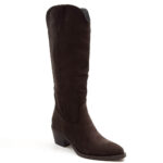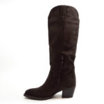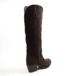 | Μπότα cowboy, μέχρι το γόνατο, σε σουέτ υφή. Έχει εξώραφες λεπτομέρειες και θηλιές στο πάνω μέρος. Μυτερό τελείωμα. Κλείνει με φερμουάρ στην εσωτερική πλευρά. Το ύψος του τακουνιού είναι 5,5 εκ. |