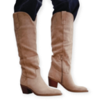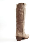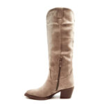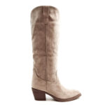 Μπότα cowboy, μέχρι το γόνατο, σε σουέτ υφή. Έχει εξώραφες λεπτομέρειες και θηλιές στο πάνω μέρος. Μυτερό τελείωμα. Κλείνει με φερμουάρ στην εσωτερική πλευρά. Το ύψος του τακουνιού είναι 5,5 εκ.