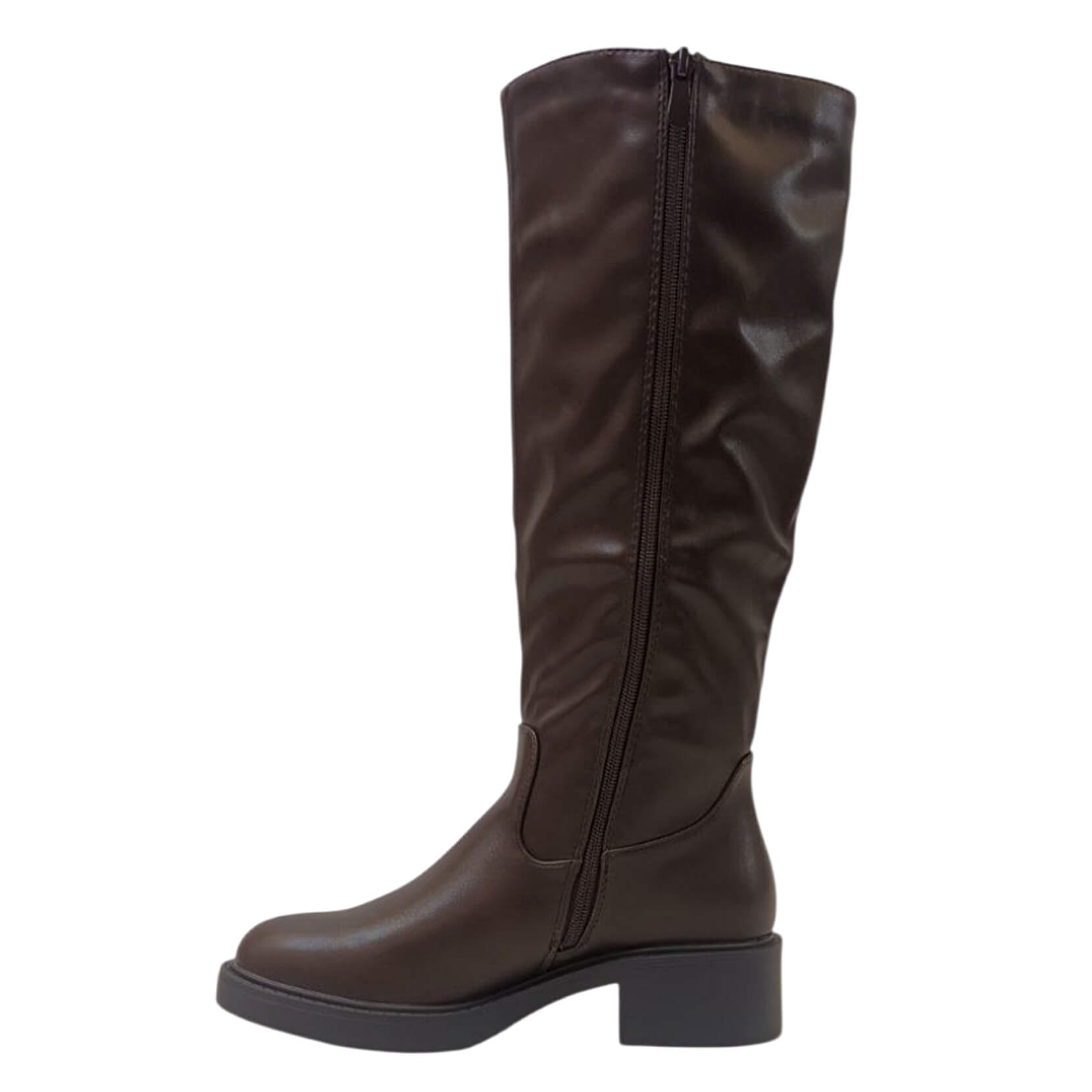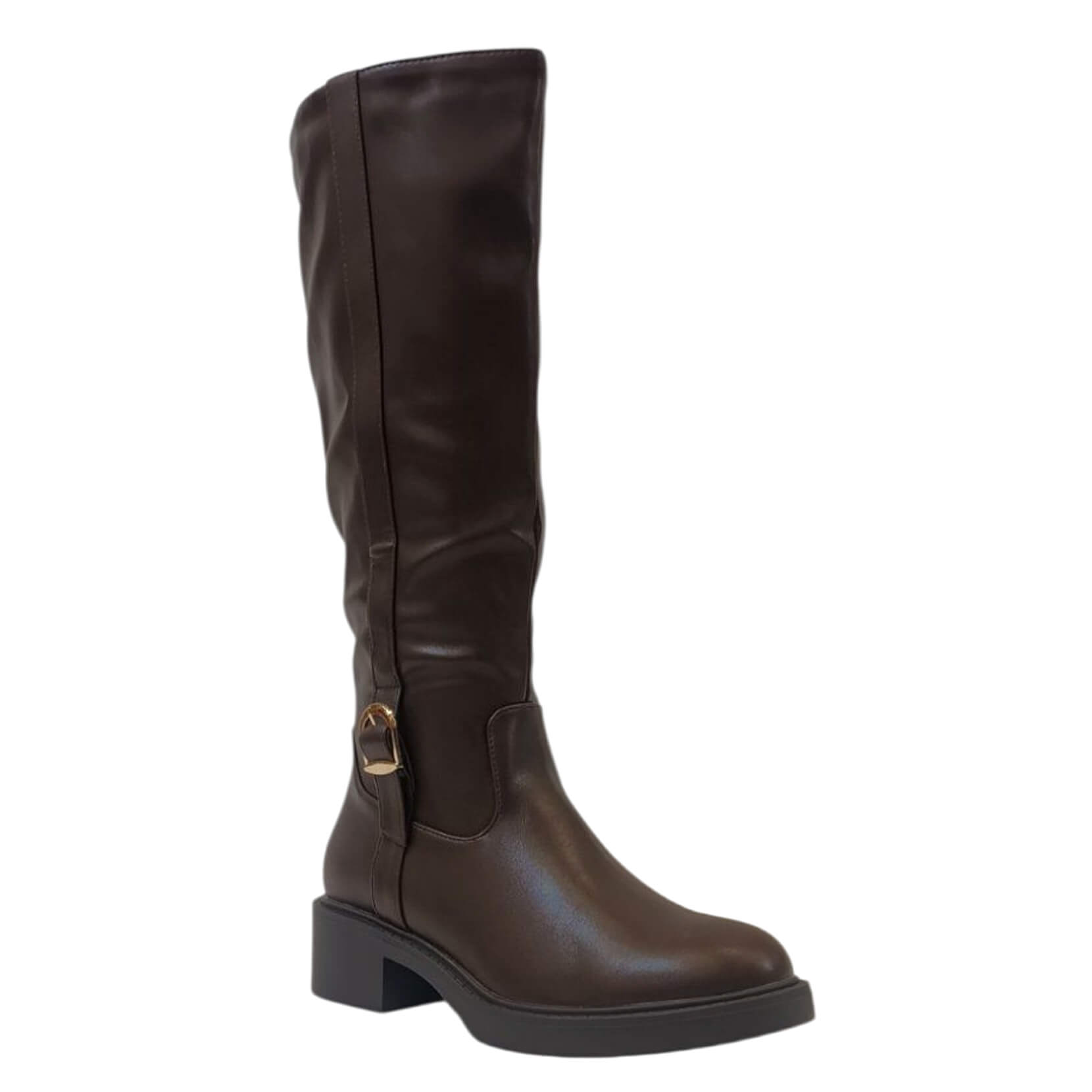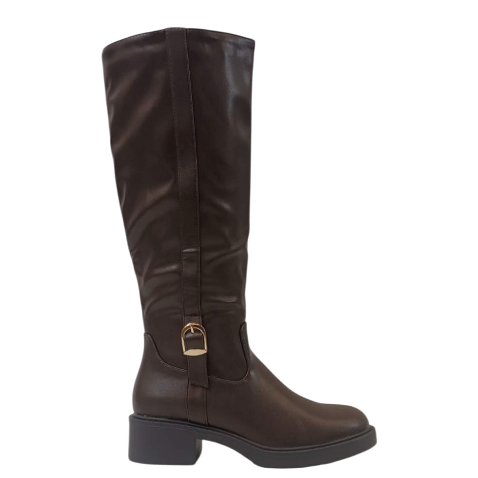 | Μπότα τύπου ιππασίας με χρυσή μεταλλική αγκράφα στο πλάϊ, από οικολογικό δέρμα εξαιρετικής ποιότητας. Κλείνει στην εσωτερική πλευρά με φερμουάρ. Έχει αντιολισθητική σόλα και το ύψος του τακουνιού είναι 4 εκ. |
