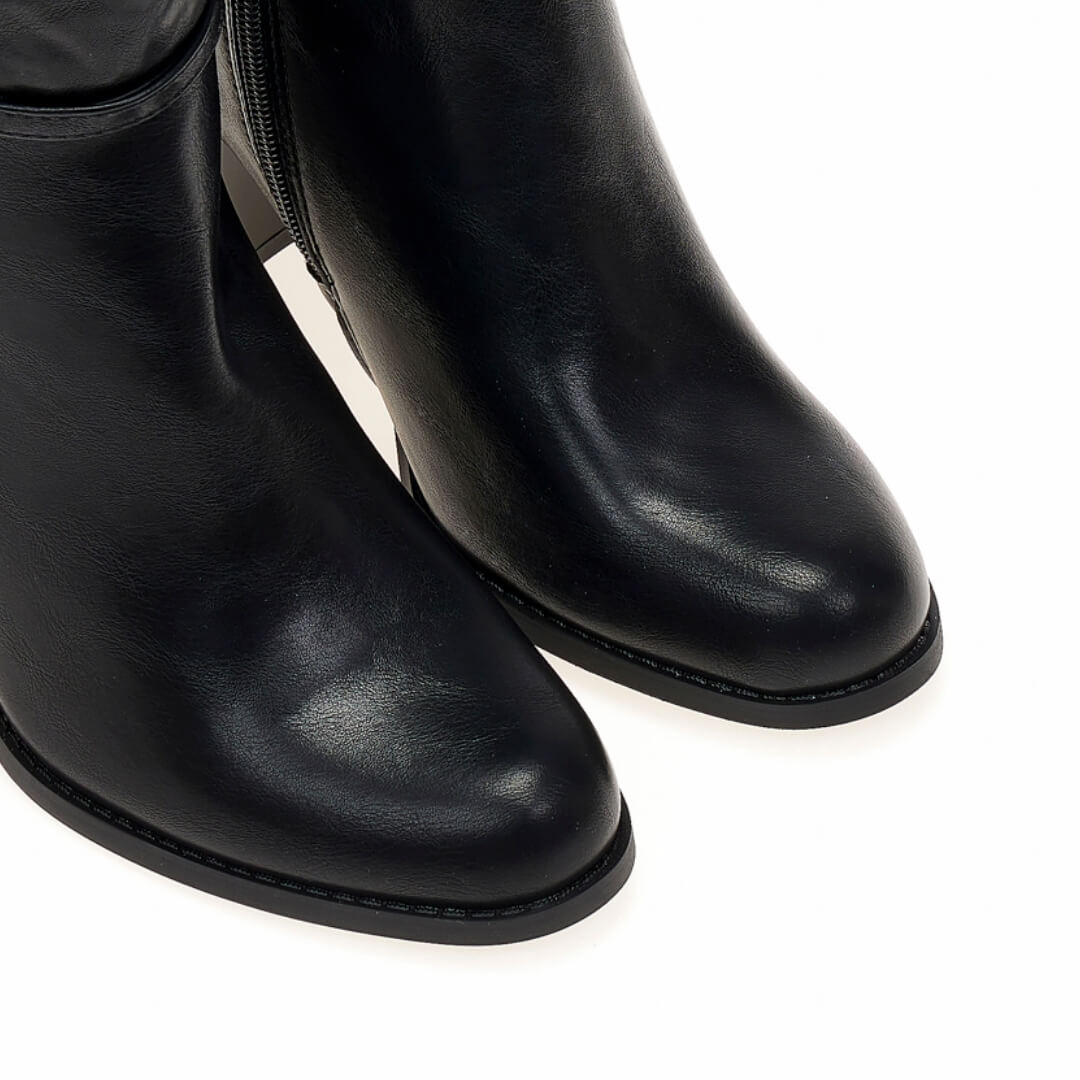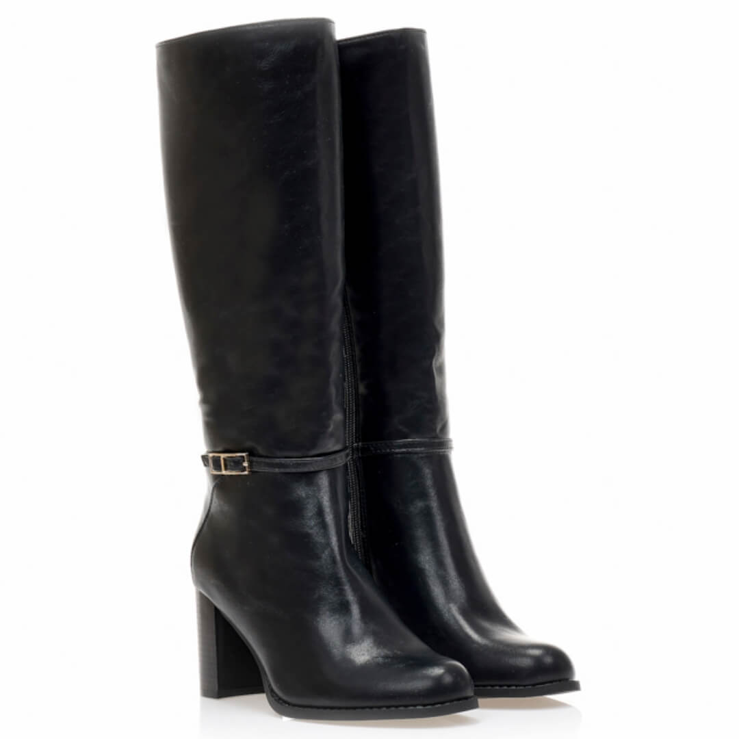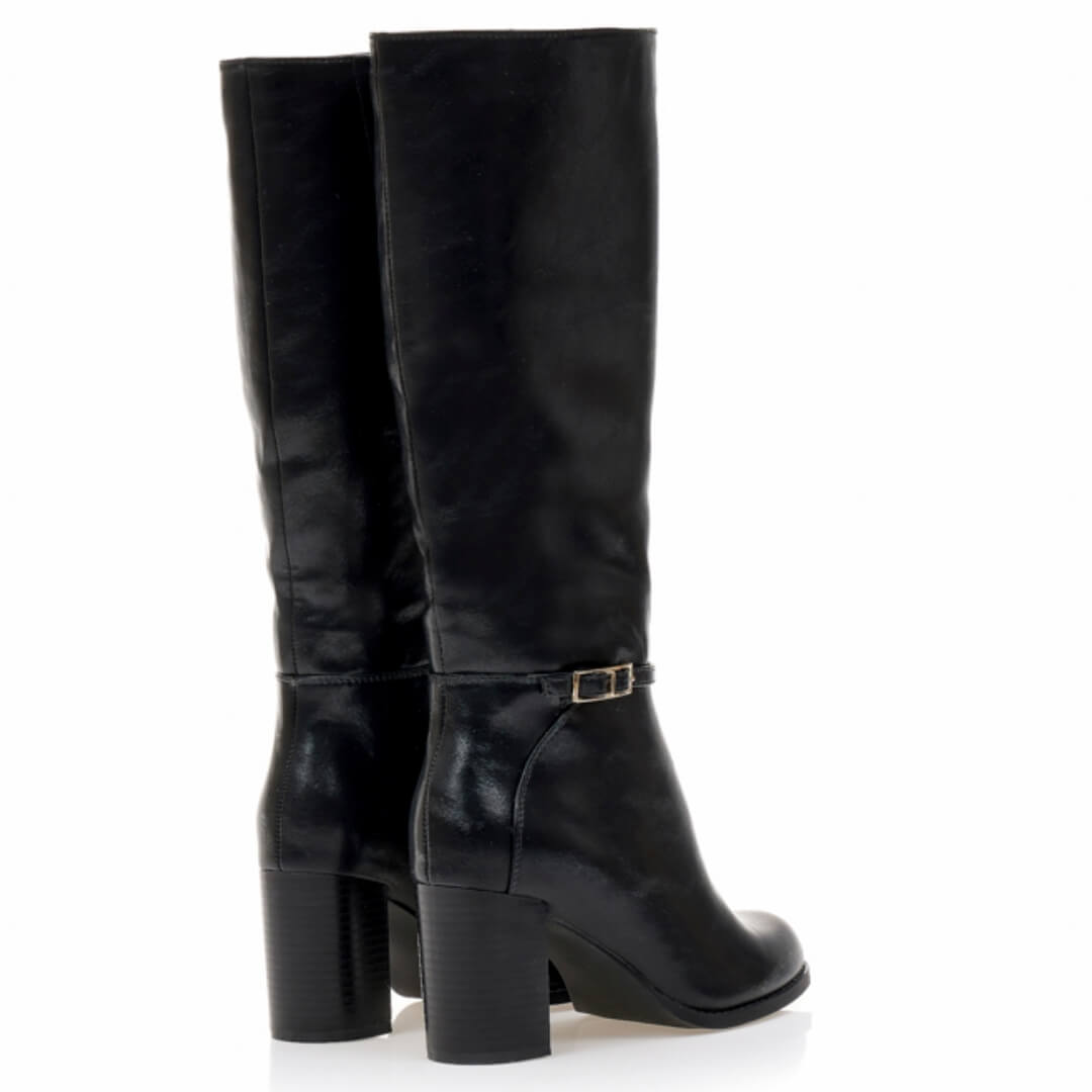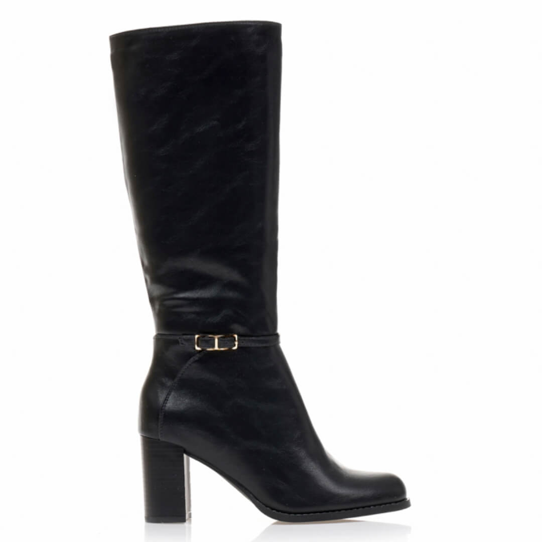 | Μπότα ψηλή, μέχρι το γόνατο με εξώραφες λεπτομέρειες και χοντρό τακούνι. Διακριτική αγκράφα στο πλάϊ. Κλείνει με φερμουάρ στην εσωτερική πλευρά. Το ύψος του τακουνιού είναι 7 εκ. |