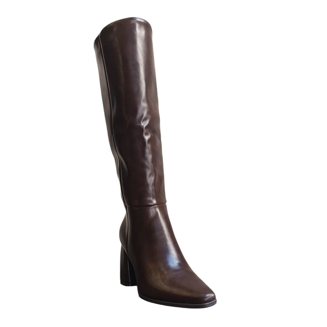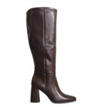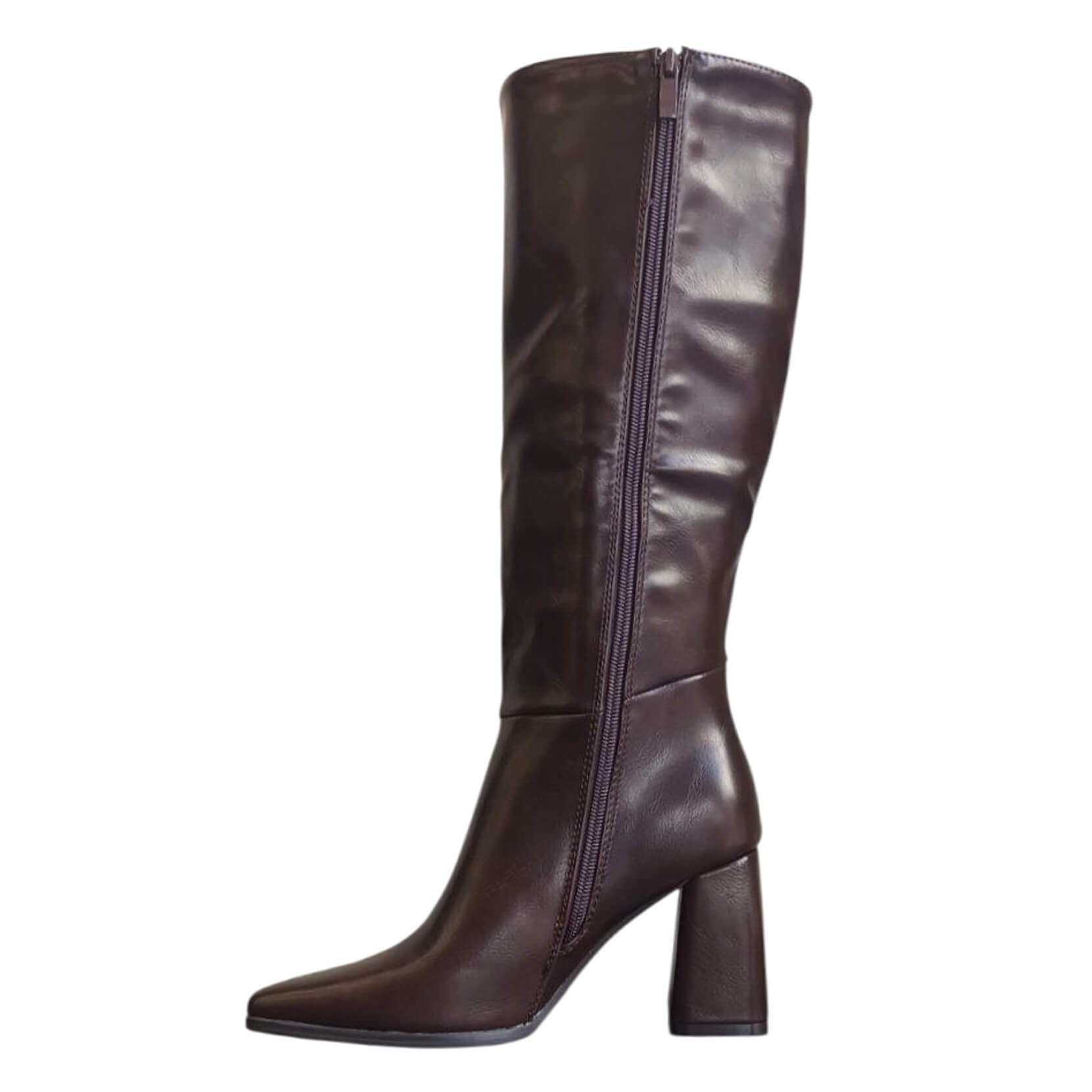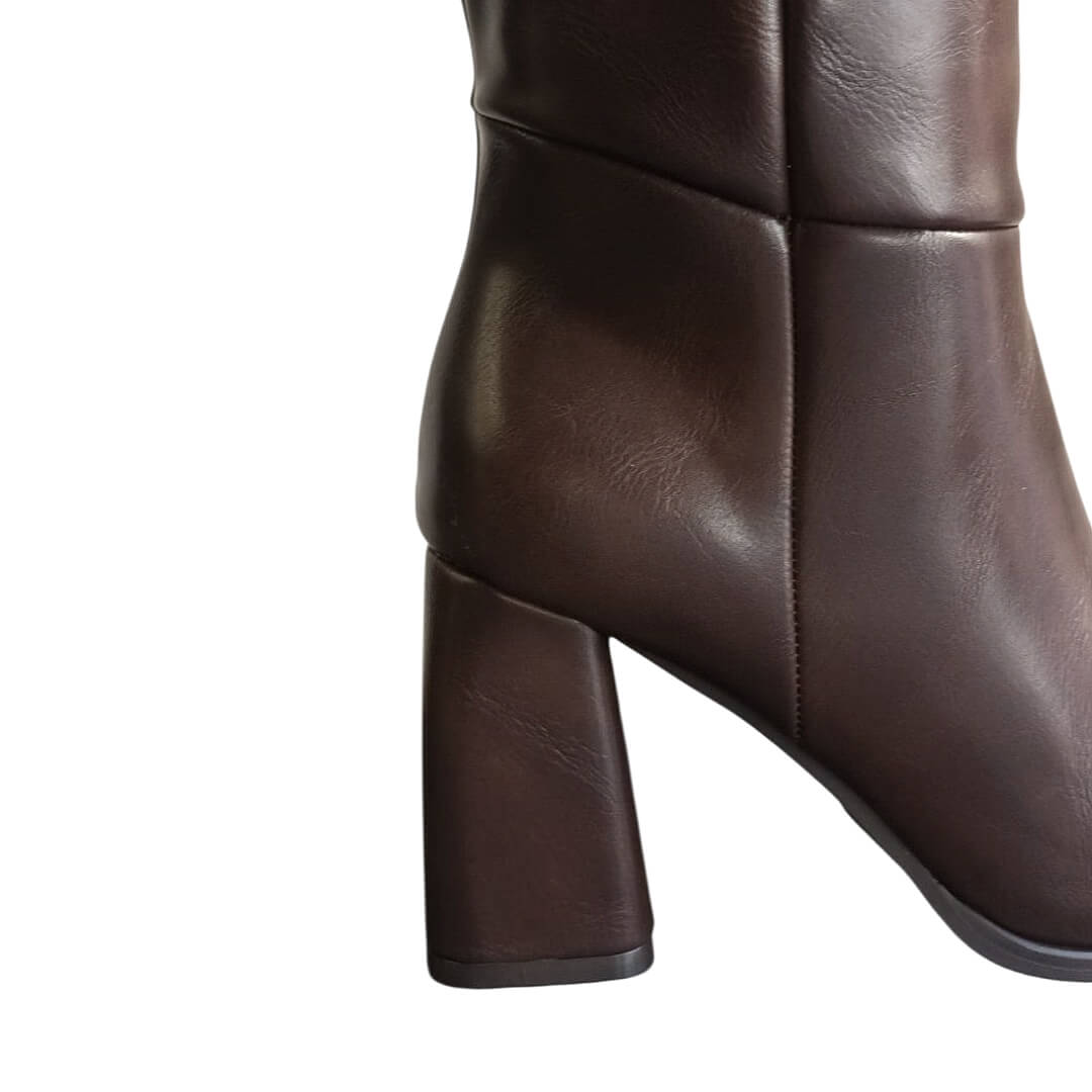 Μπότα με ραφές και χοντρό τετράγωνο τακούνι, από οικολογικό δέρμα. Μυτερό τελείωμα. Κλείνει με φερμουάρ στην εσωτερική πλευρά. Το ύψος του τακουνιού είναι 8 εκ.