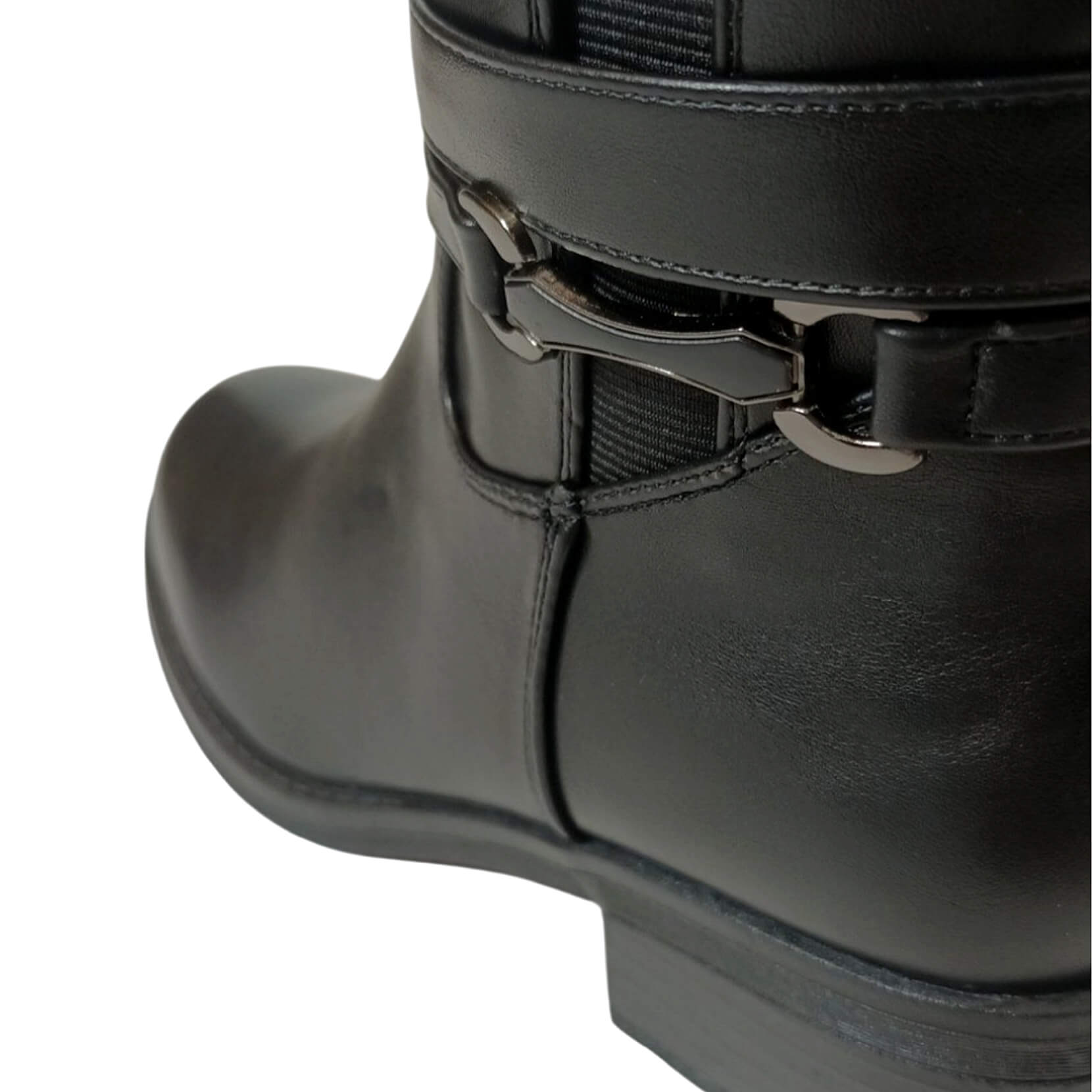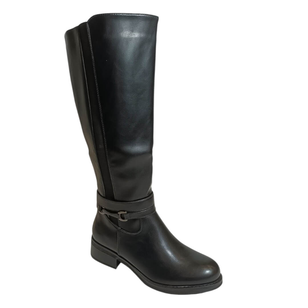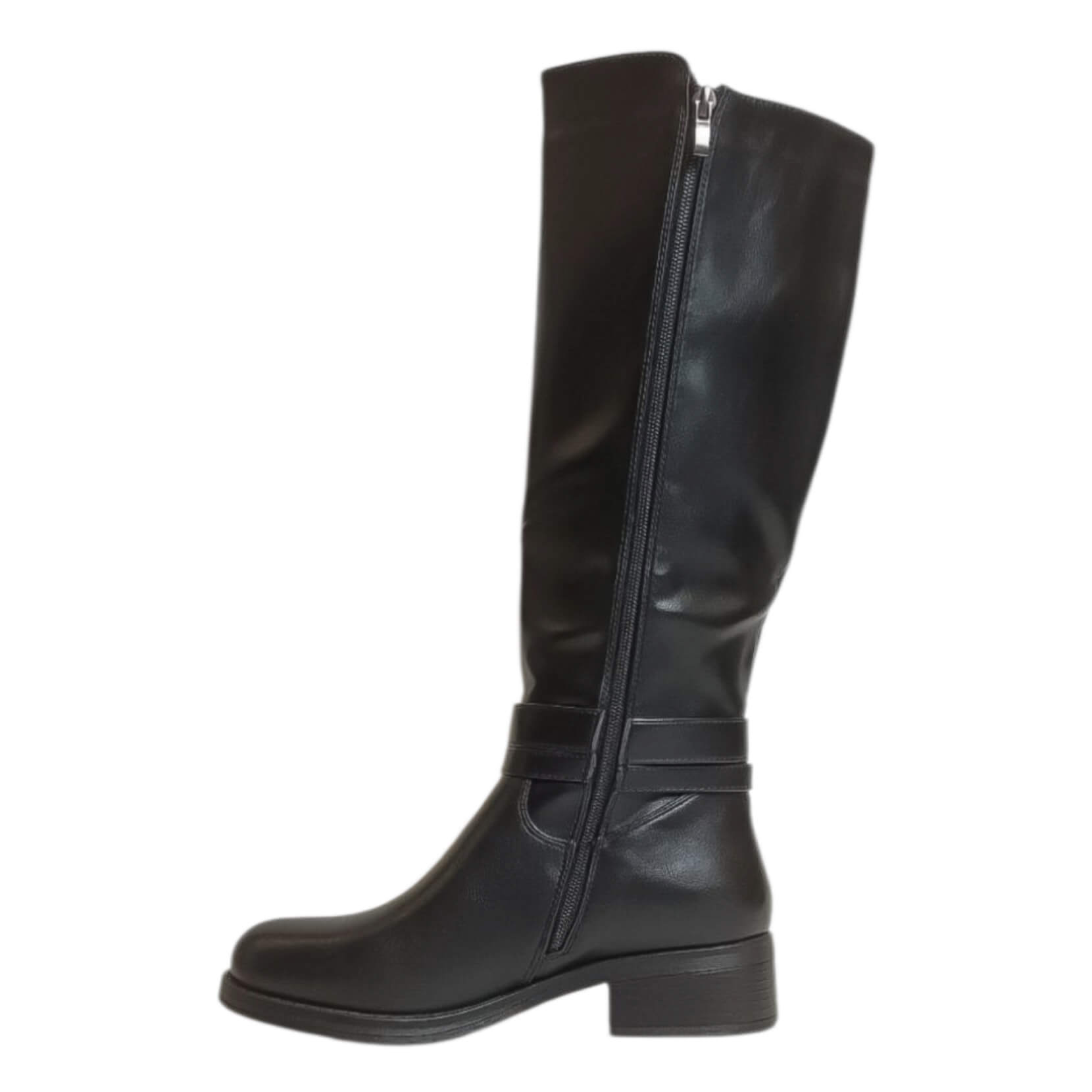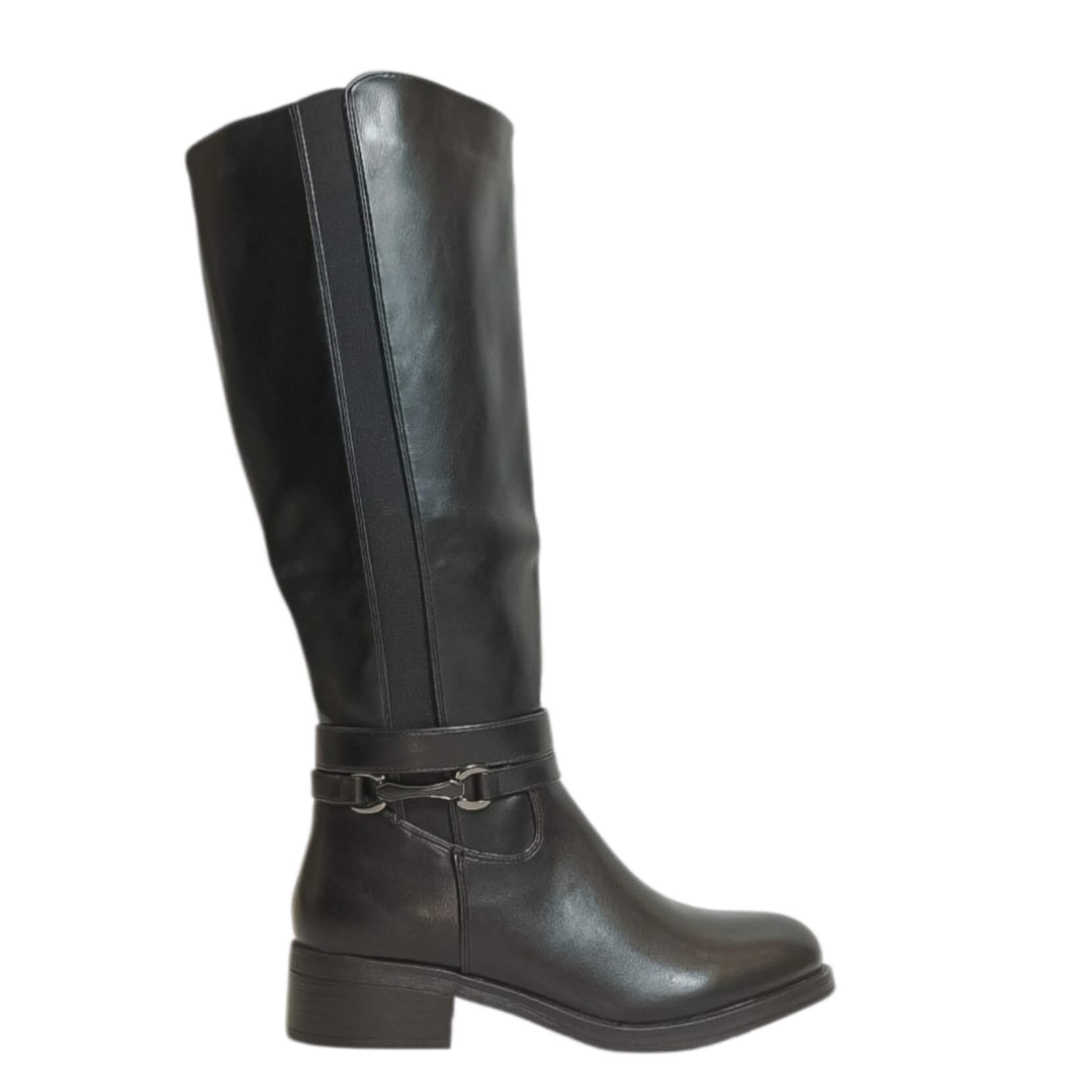 | Μπότα τύπου ιππασίας με μεταλλική αγκράφα στο πλάϊ, από οικολογικό δέρμα εξαιρετικής ποιότητας. Έχει λάστιχο στο πλάϊ για άνετη εφαρμογή στην γάμπα. Κλείνει στην εσωτερική πλευρά με φερμουάρ. Έχει αντιολισθητική σόλα και το ύψος του τακουνιού είναι 3,5 εκ. |