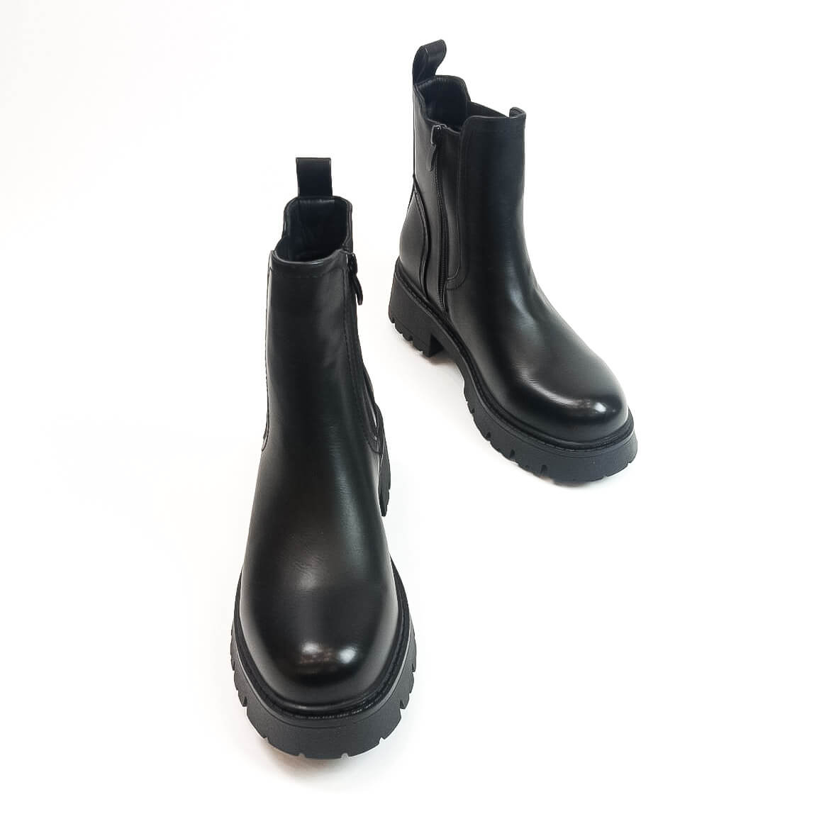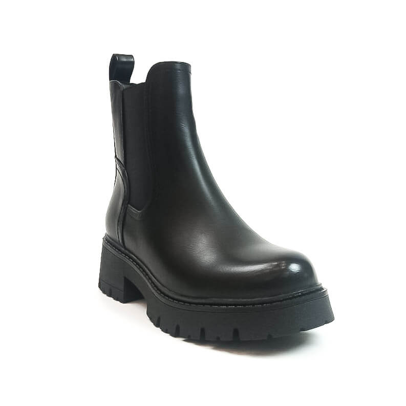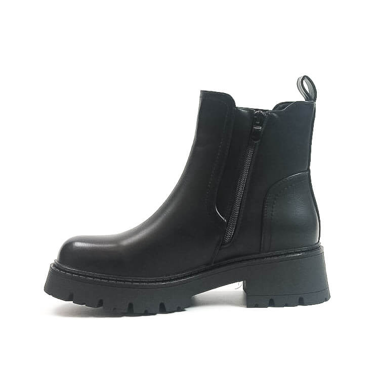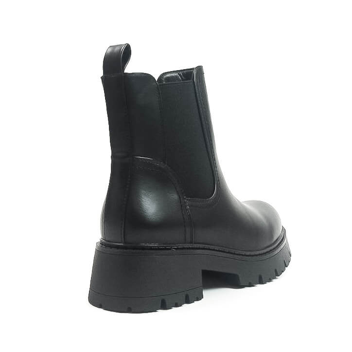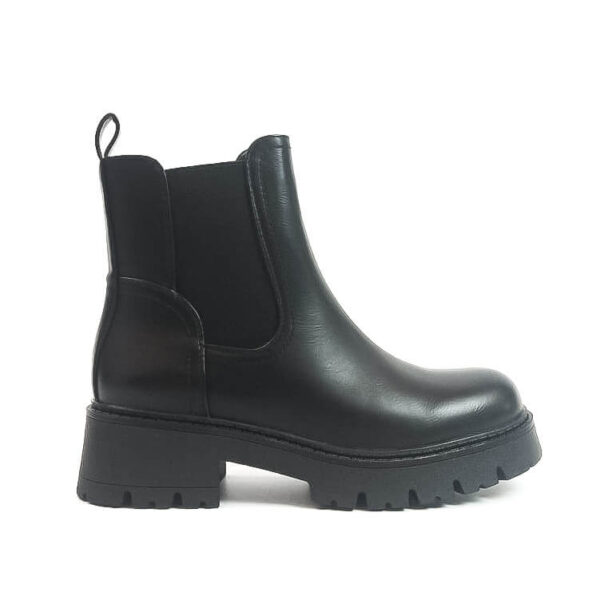 | Mποτάκι chelsea με λάστιχο στο πλάϊ και τρακτερωτή σόλα. Είναι από οικολογικό δέρμα και κλείνει με φερμουάρ στην εσωτερική πλευρά. Το ύψος του τακουνιού είναι 4,5 εκ. |