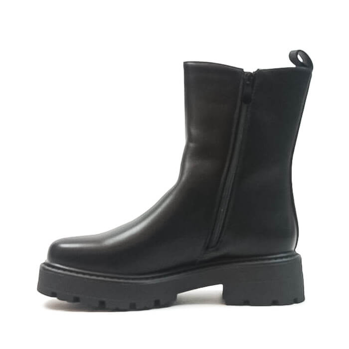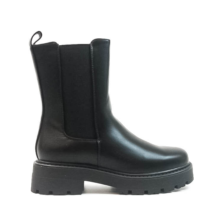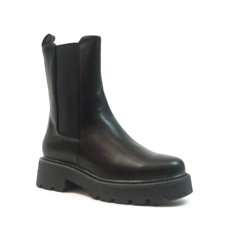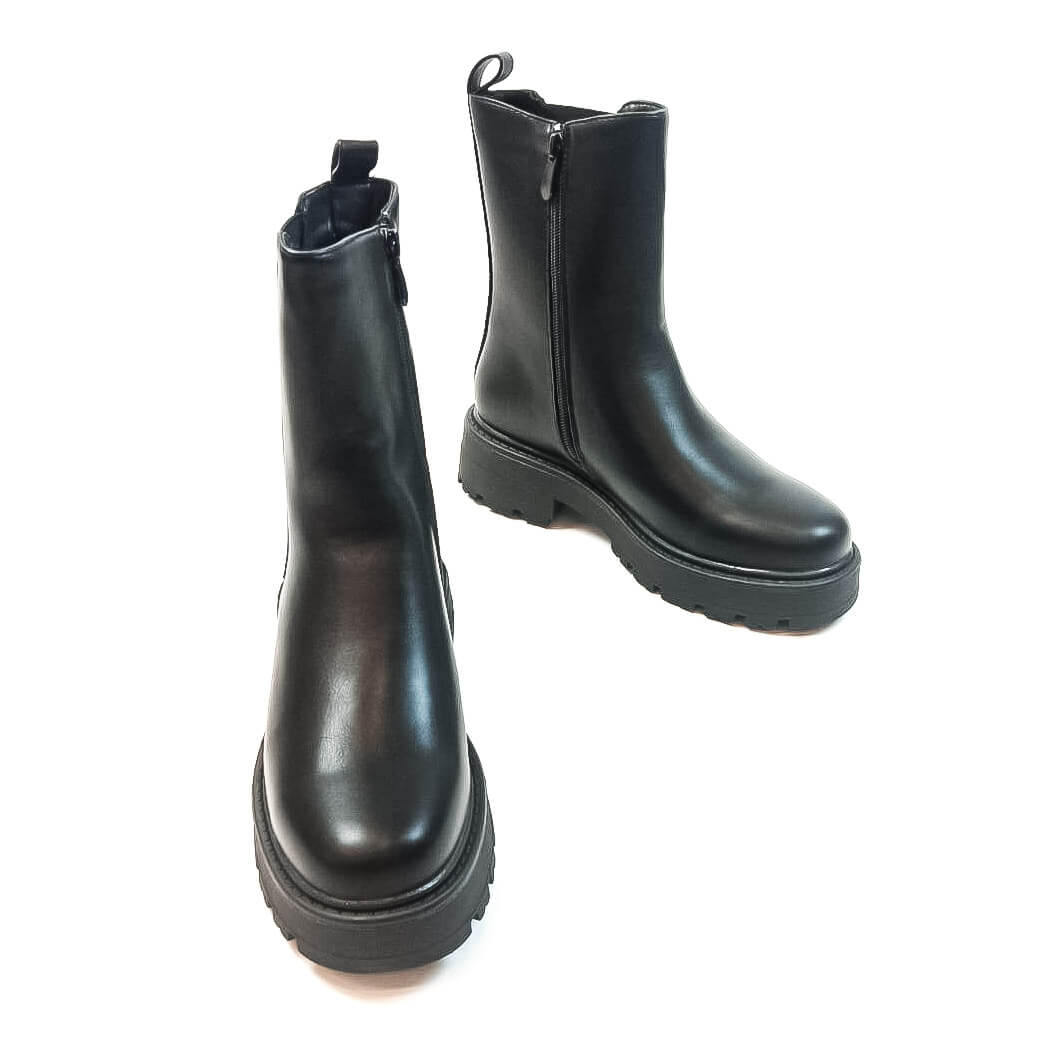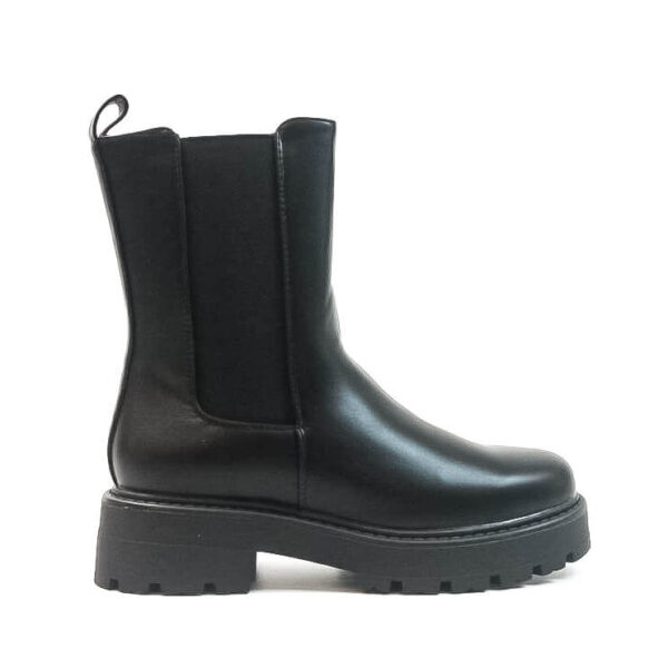 | Mποτάκι chelsea με λάστιχο στο πλάϊ και τρακτερωτή σόλα. Είναι από οικολογικό δέρμα και κλείνει με φερμουάρ στην εσωτερική πλευρά. Το ύψος του τακουνιού είναι 4,5 εκ. |