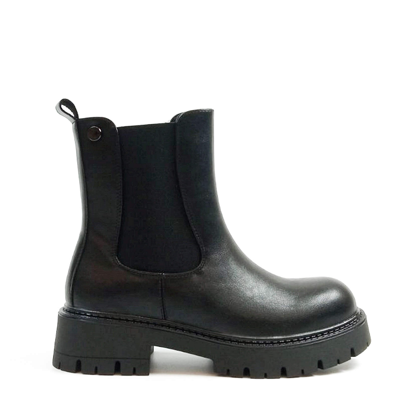 | Mποτάκι chelsea με λάστιχο στο πλάϊ και τρακτερωτή σόλα. Είναι από οικολογικό δέρμα και κλείνει με φερμουάρ στην εσωτερική πλευρά. Έχει αντιολισθητική σόλα και το ύψος του τακουνιού είναι 4 εκ. |