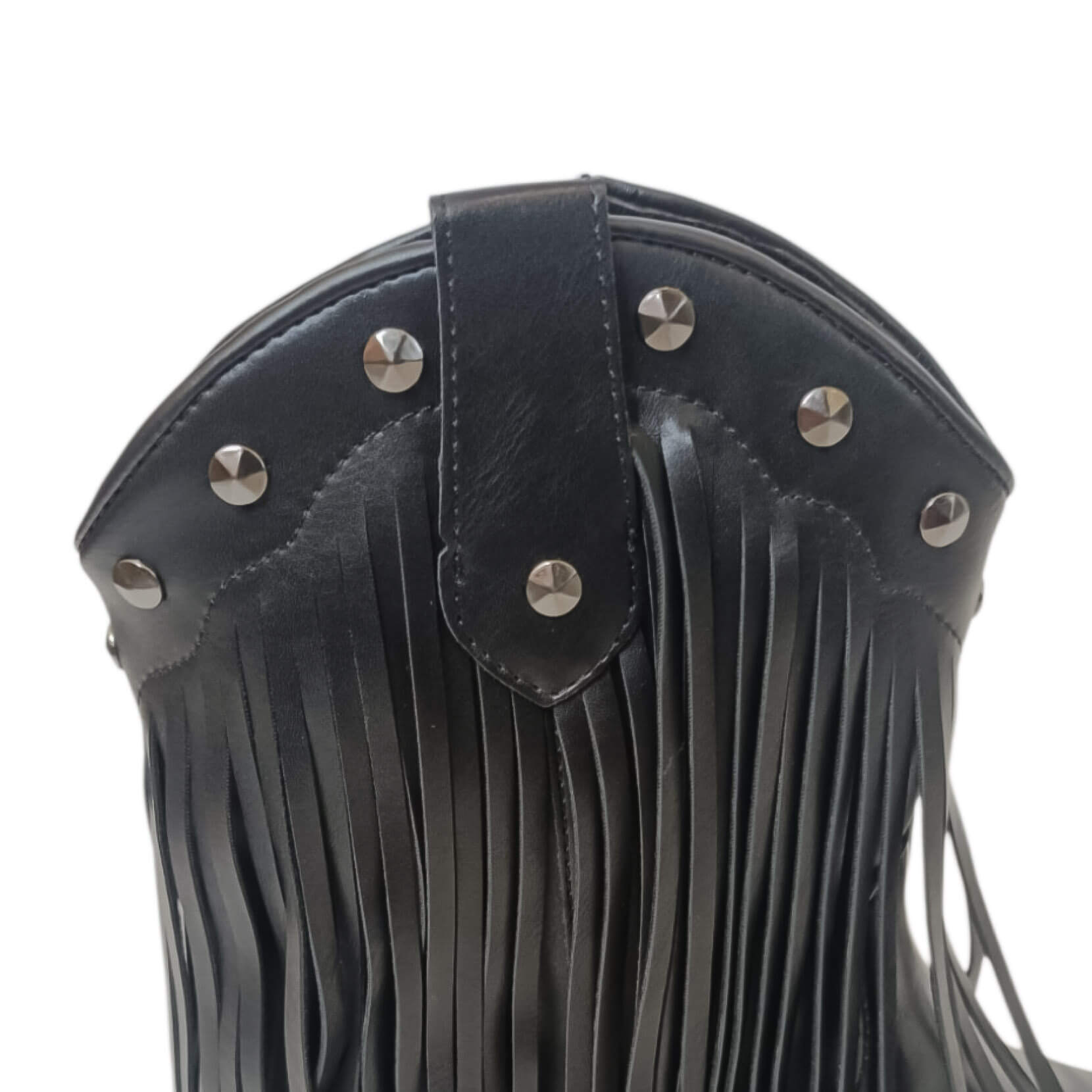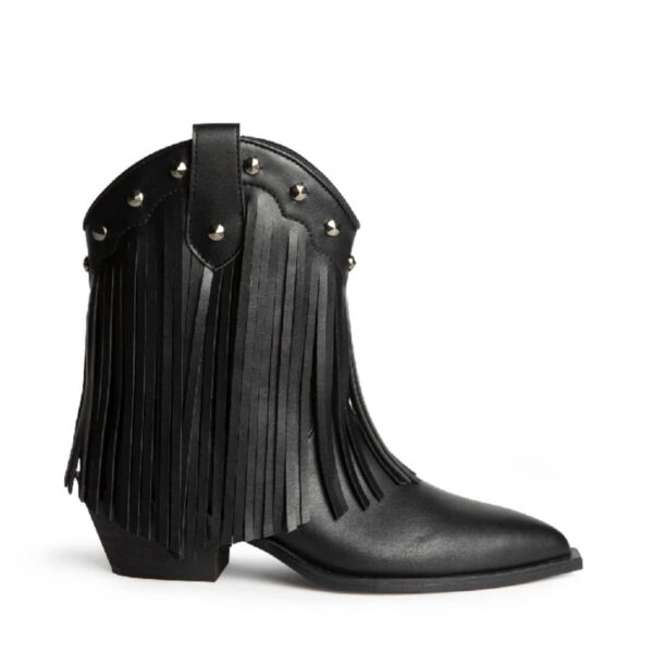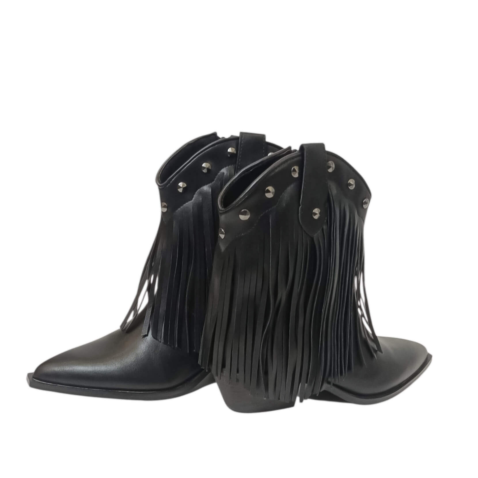 Μποτάκι Corina cowboy με κρόσσια, από οικολογικό δέρμα. Διακόσμηση με τρουκς και θηλιά στο πάνω μέρος. Kλείνει με φερμουάρ στην εσωτερική πλευρά. Το ύψος του τακουνιού είναι 5 εκ.