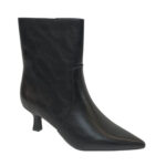 | Μποτάκι με χαμηλό kitten τακούνι και εξώραφες λεπτομέρειες, από οικολογικό δέρμα. Κλείνει με φερμουάρ στην εσωτερική πλευρά. Μυτερό τελείωμα. Το ύψος του τακουνιού είναι 5,5 εκ. |