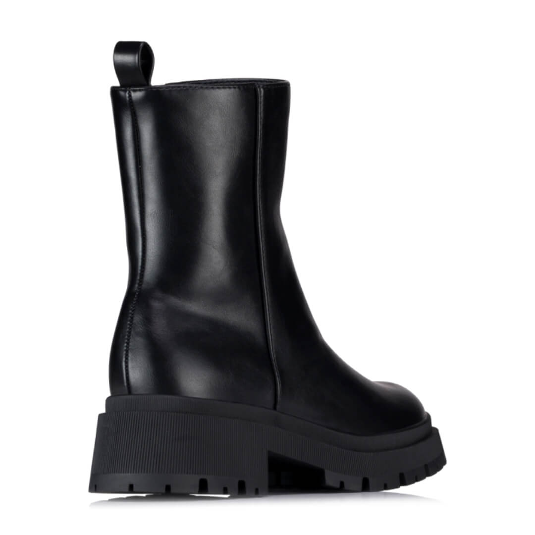 | Mποτάκι chelsea με λάστιχο και διακριτική μεταλλική αγκράφα στο πλάϊ. Είναι από οικολογικό δέρμα και κλείνει με φερμουάρ στην εσωτερική πλευρά. Έχει αντιολισθητική τρακτερωτή σόλα και το ύψος του τακουνιού είναι εκ. |