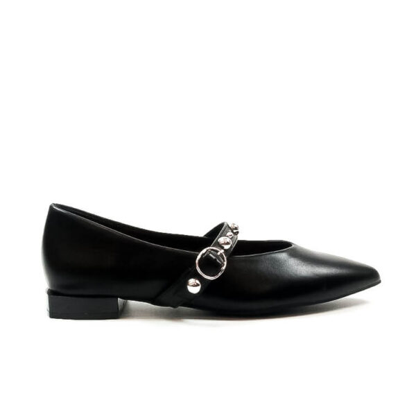 Φλατ μυτερή μπαλαρίνα από οικολογικό δέρμα. Έχει 1 μπαρέτα διακοσμημένη με τρουκς στο πάνω μέρος. Το ύψος του τακουνιού είναι 1,5 εκ.