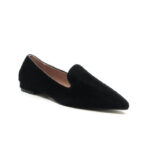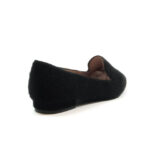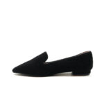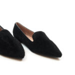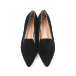 | Γόβα χαμηλή μαύρη, σε ponyskin υφή, από οικολογικό δέρμα. Μυτερό τελείωμα. Το ύψος του τακουνιού είναι 2 εκ. |