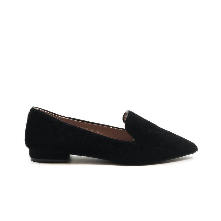 | Γόβα χαμηλή μαύρη, σε ponyskin υφή, από οικολογικό δέρμα. Μυτερό τελείωμα. Το ύψος του τακουνιού είναι 2 εκ. |