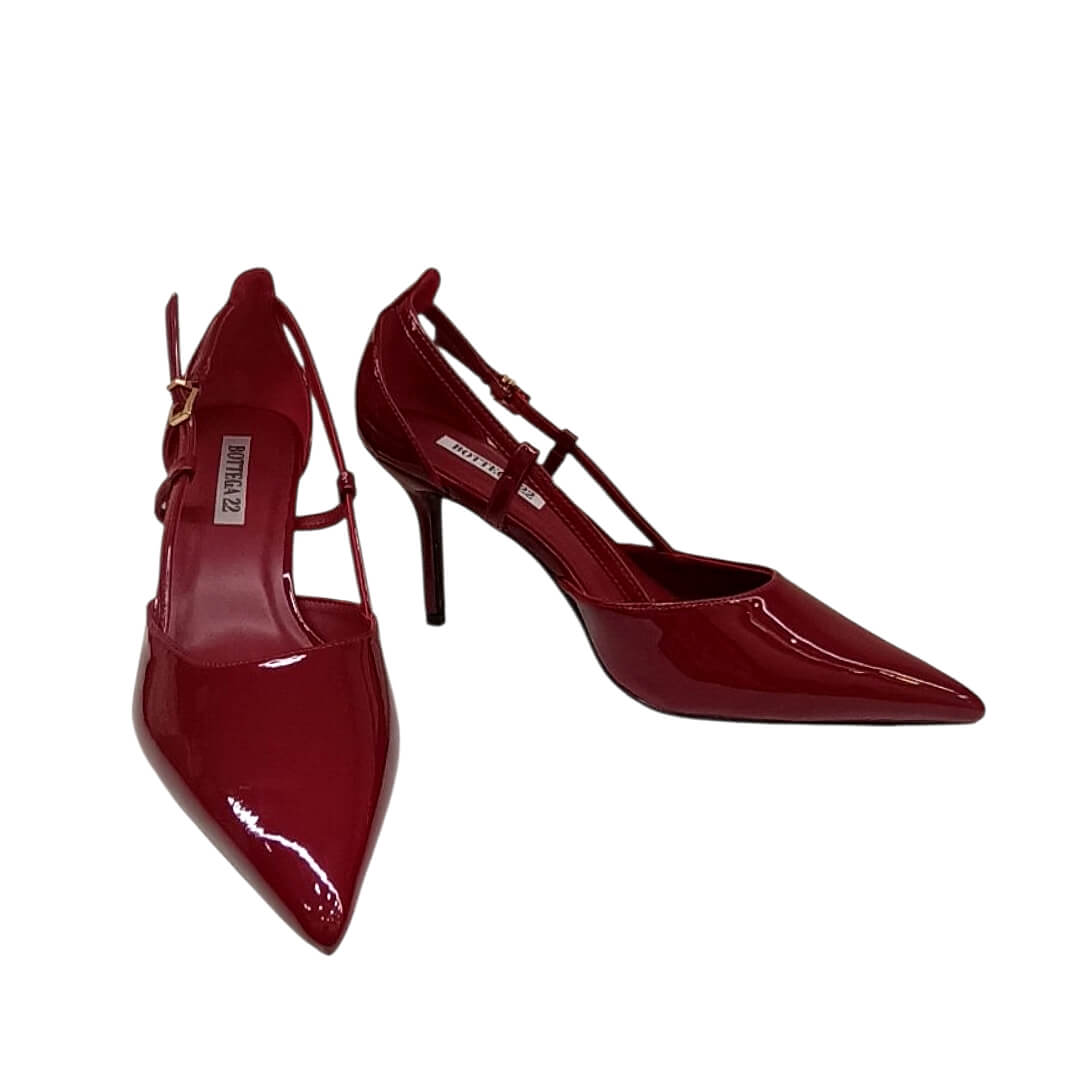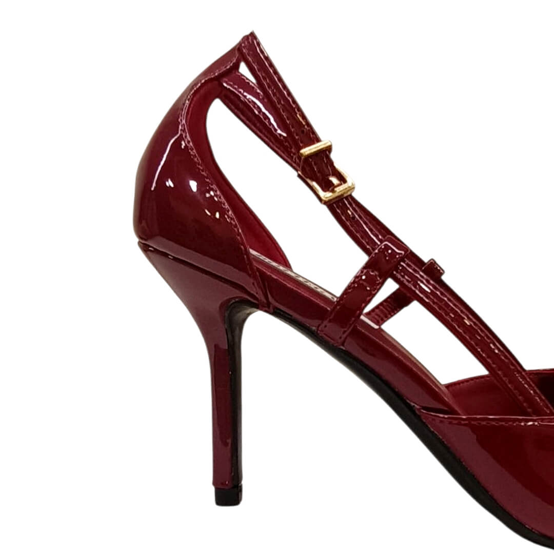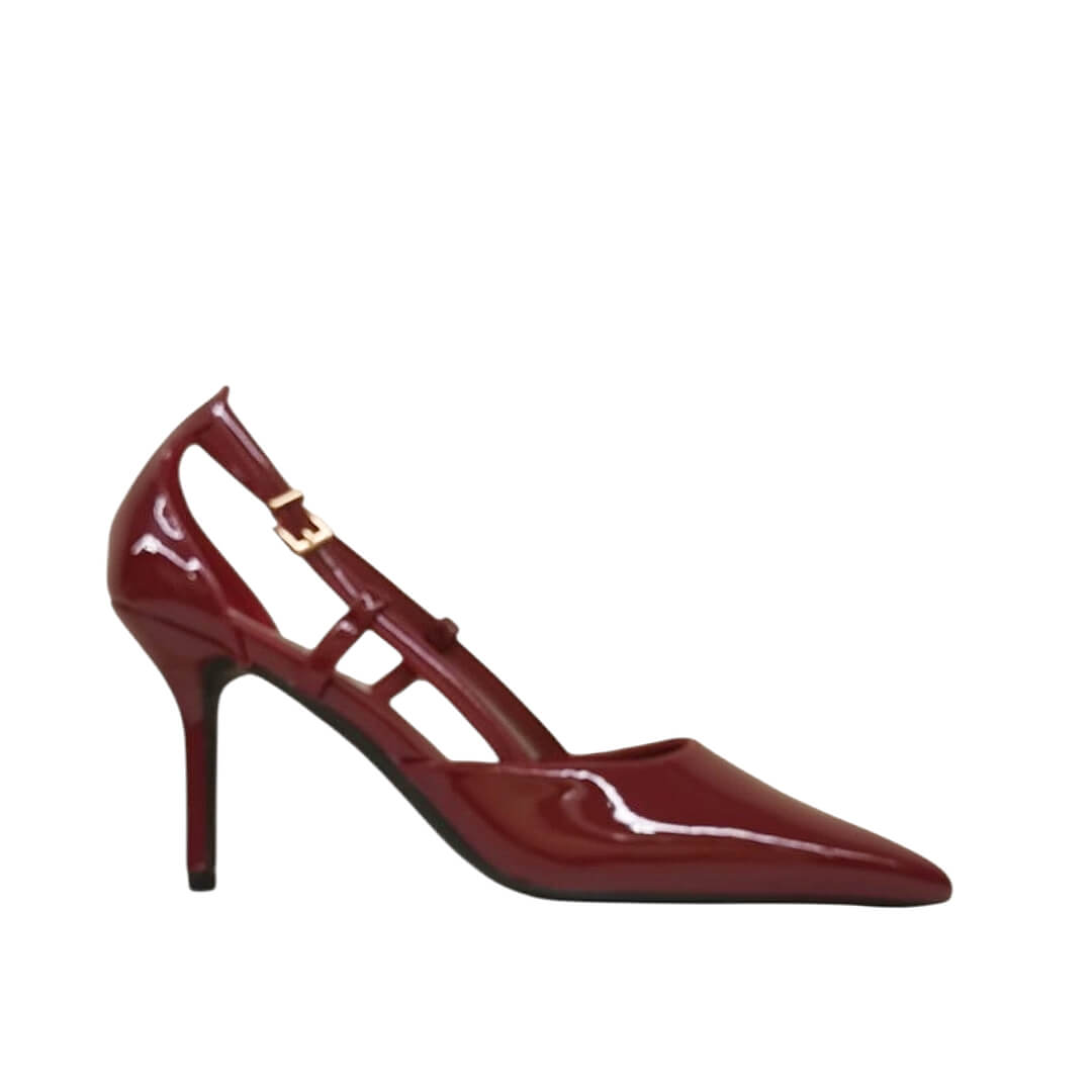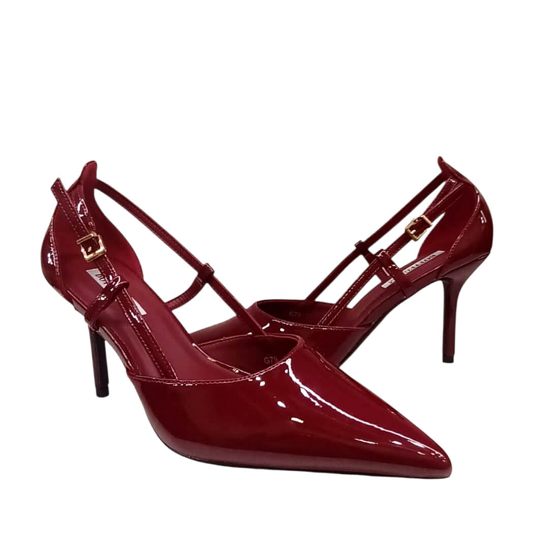 | Γόβα μυτερή με λεπτό τακούνι, από οικολογικό λουστρίνι. Έχει ανοίγματα στο πλάϊ και κούμπωμα στον αστράγαλο. Το ύψος του τακουνιού είναι 8 εκ. Μια κομψή και στυλάτη επιλογή για πολλές περιστάσεις! |