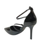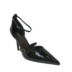 Γόβα μυτερή με λεπτό τακούνι, από οικολογικό λουστρίνι. Έχει 2 λεπτές μπαρέτες με κούμπωμα. Το ύψος του τακουνιού είναι 9 εκ.