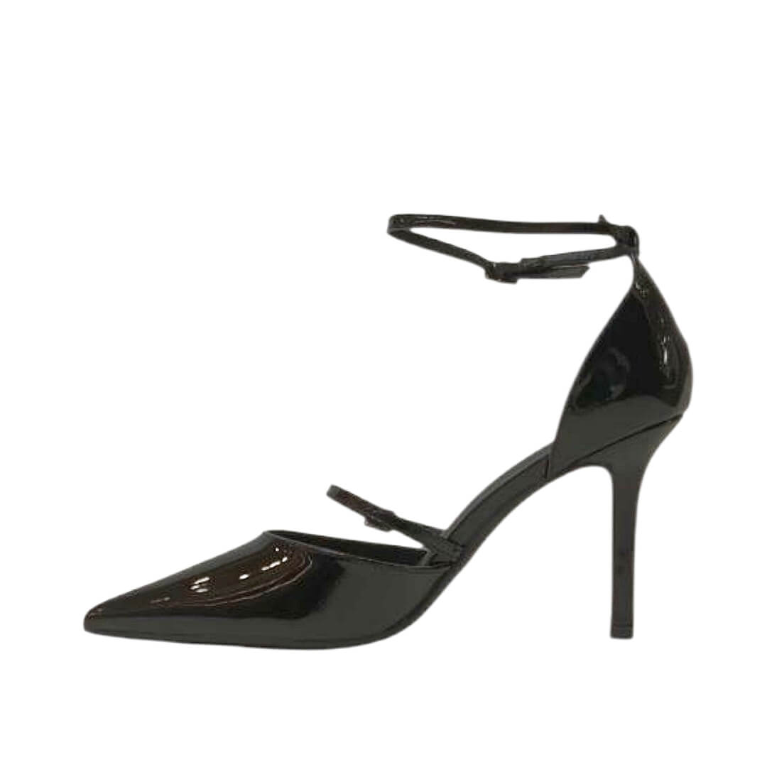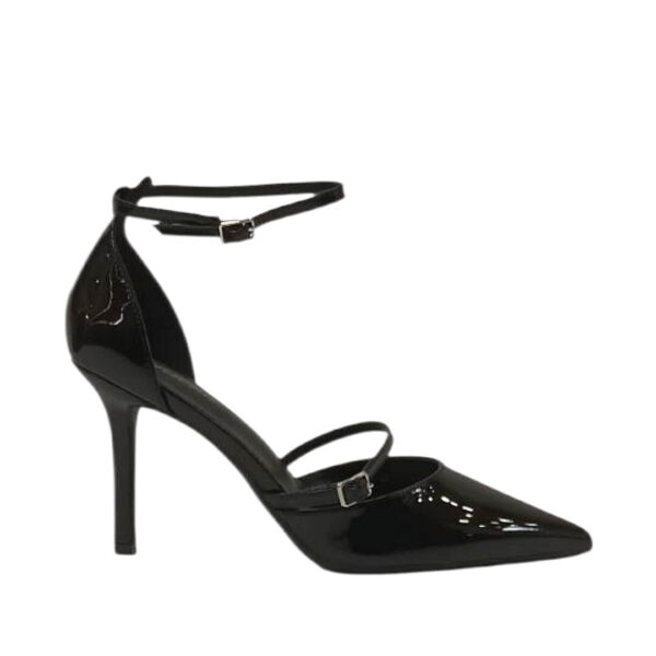 Γόβα μυτερή με λεπτό τακούνι, από οικολογικό λουστρίνι. Έχει 2 λεπτές μπαρέτες με κούμπωμα. Το ύψος του τακουνιού είναι 9 εκ.