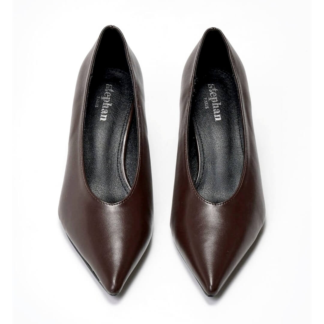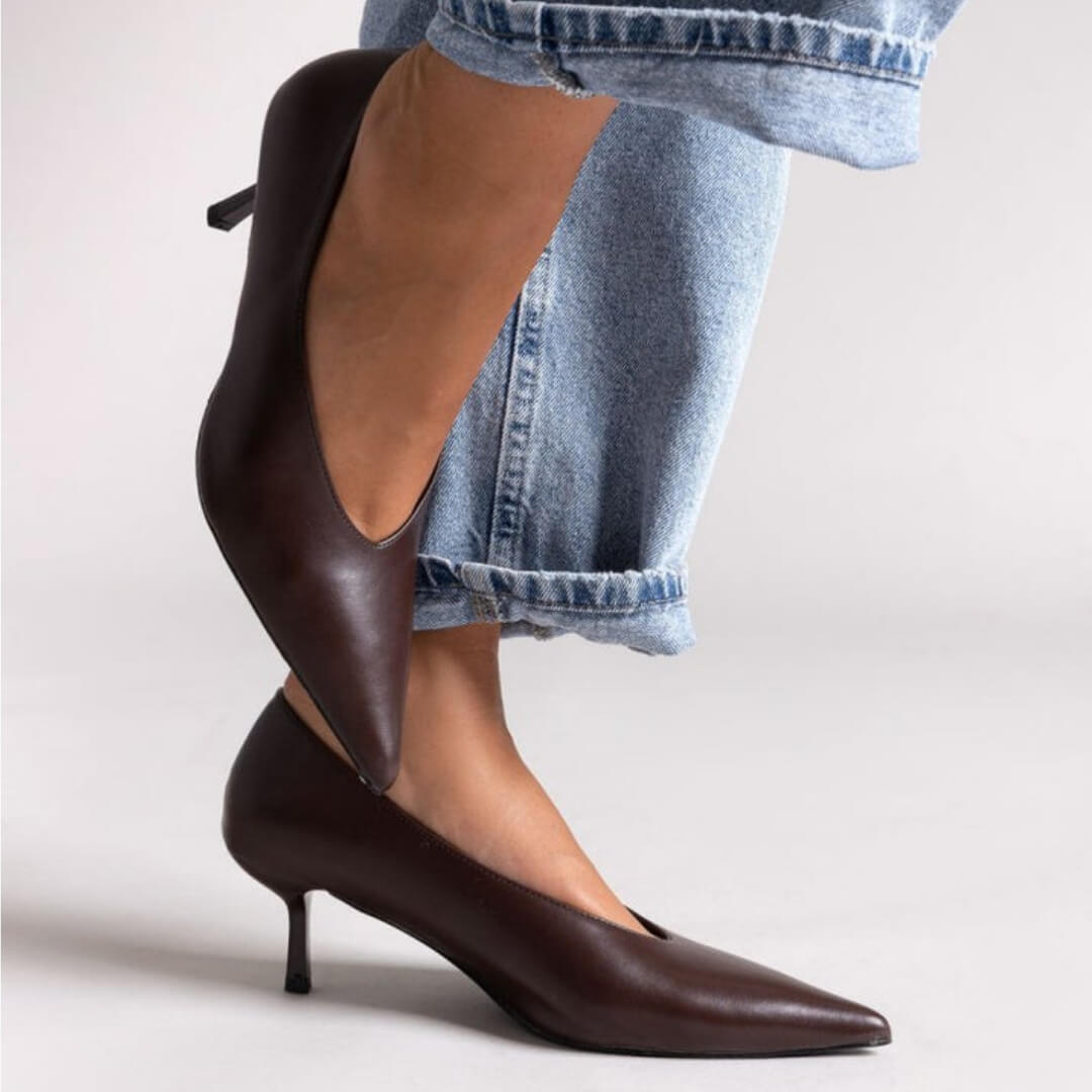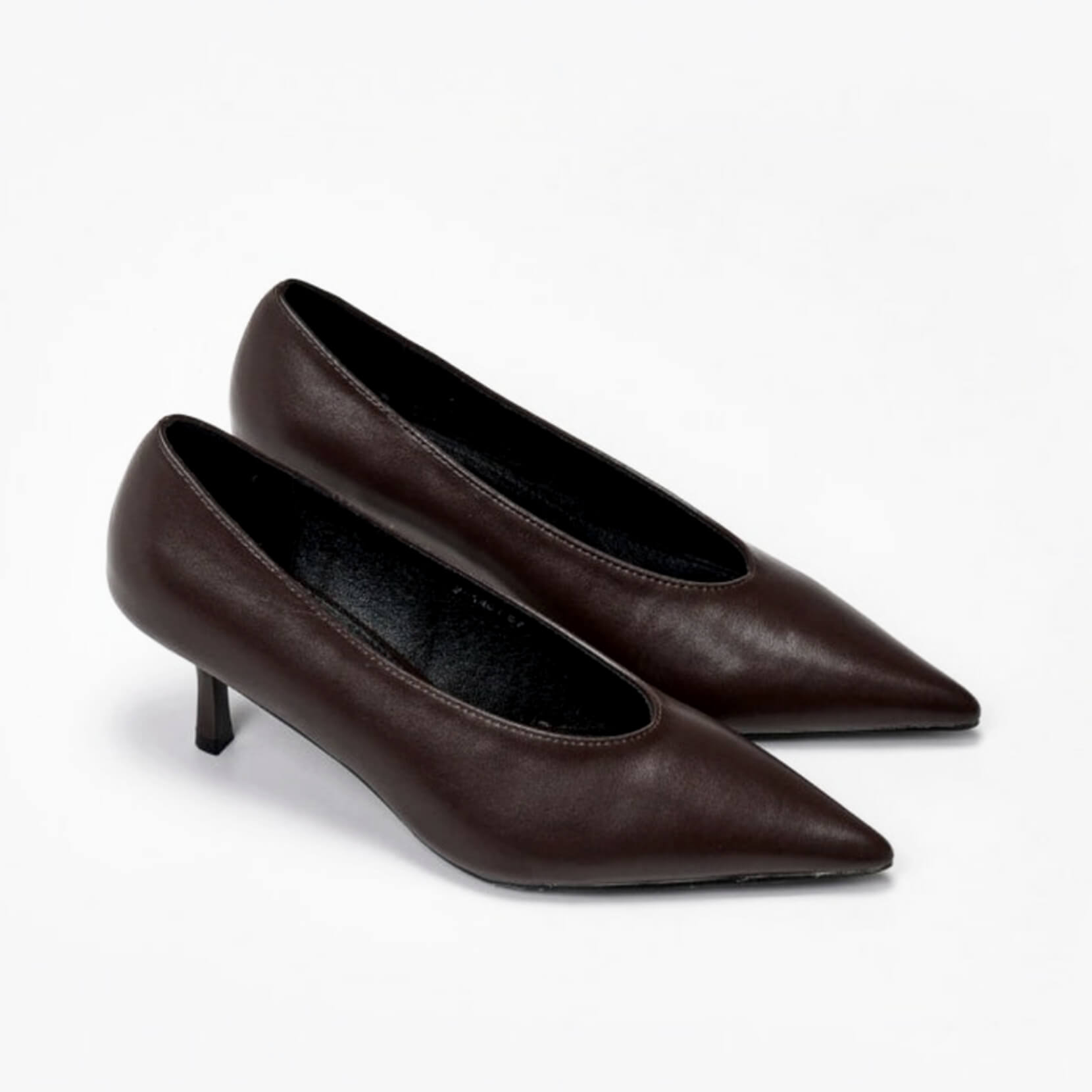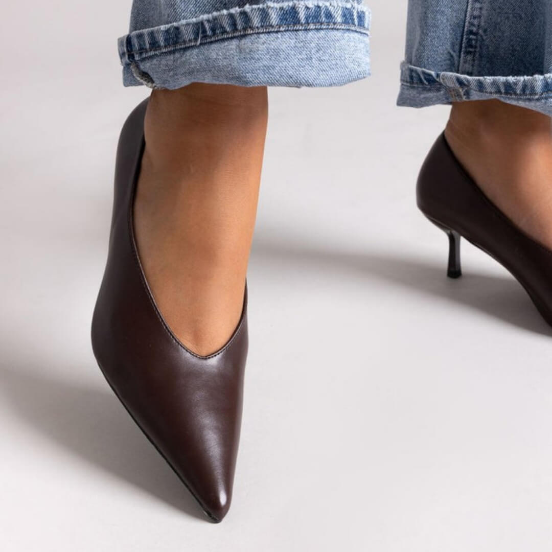 | Γόβα καφέ με χαμηλό kitten τακούνι, από οικολογικό δέρμα. Μυτερό τελείωμα. Το ύψος του τακουνιού είναι 5,5 εκ. Μια κομψή και στυλάτη επιλογή για πολλές περιστάσεις! |