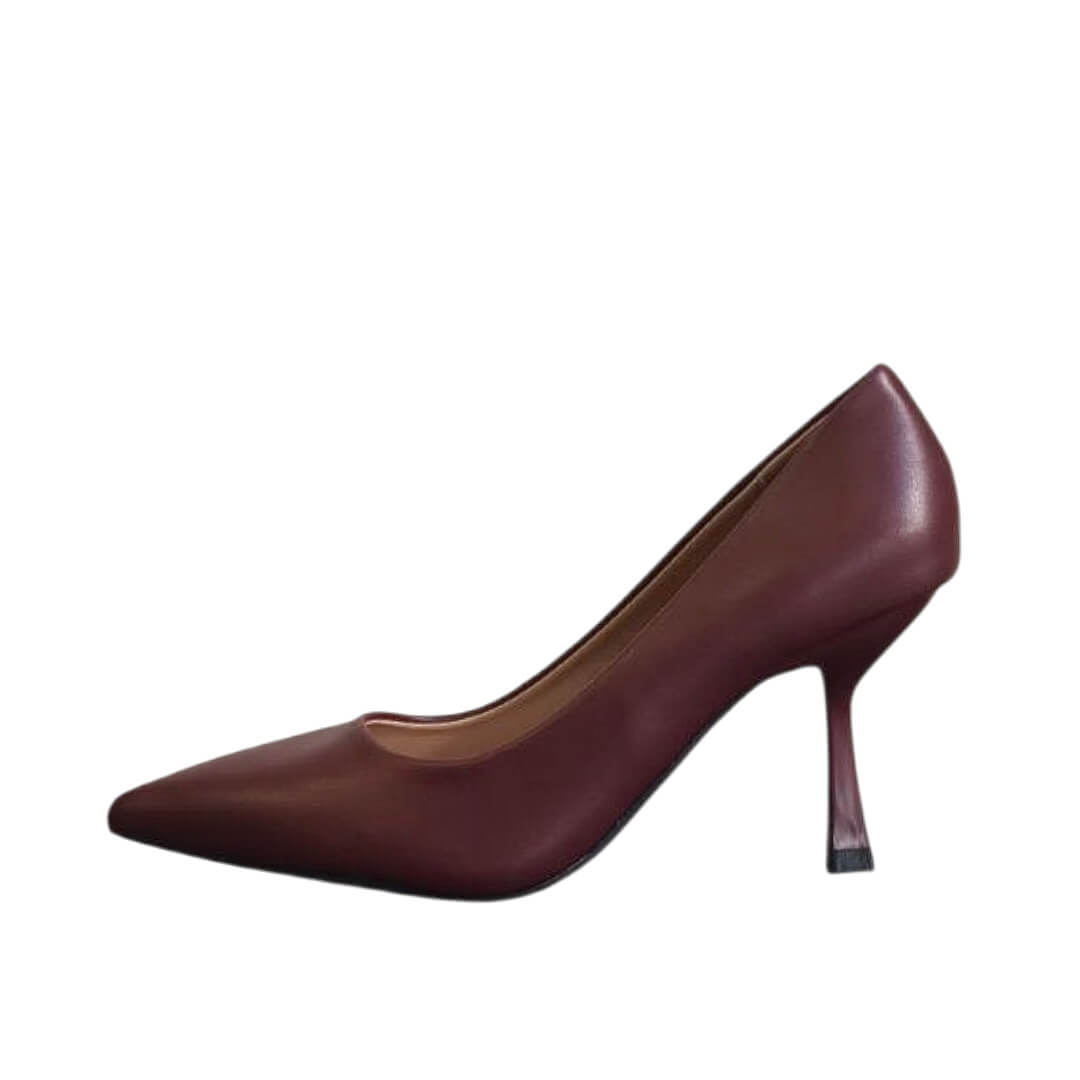 Γόβα μπορντό με λεπτό τακούνι, από οικολογικό δέρμα. Μυτερό τελείωμα. Το ύψος του τακουνιού είναι 8 εκ. Μια κομψή και στυλάτη επιλογή για πολλές περιστάσεις!