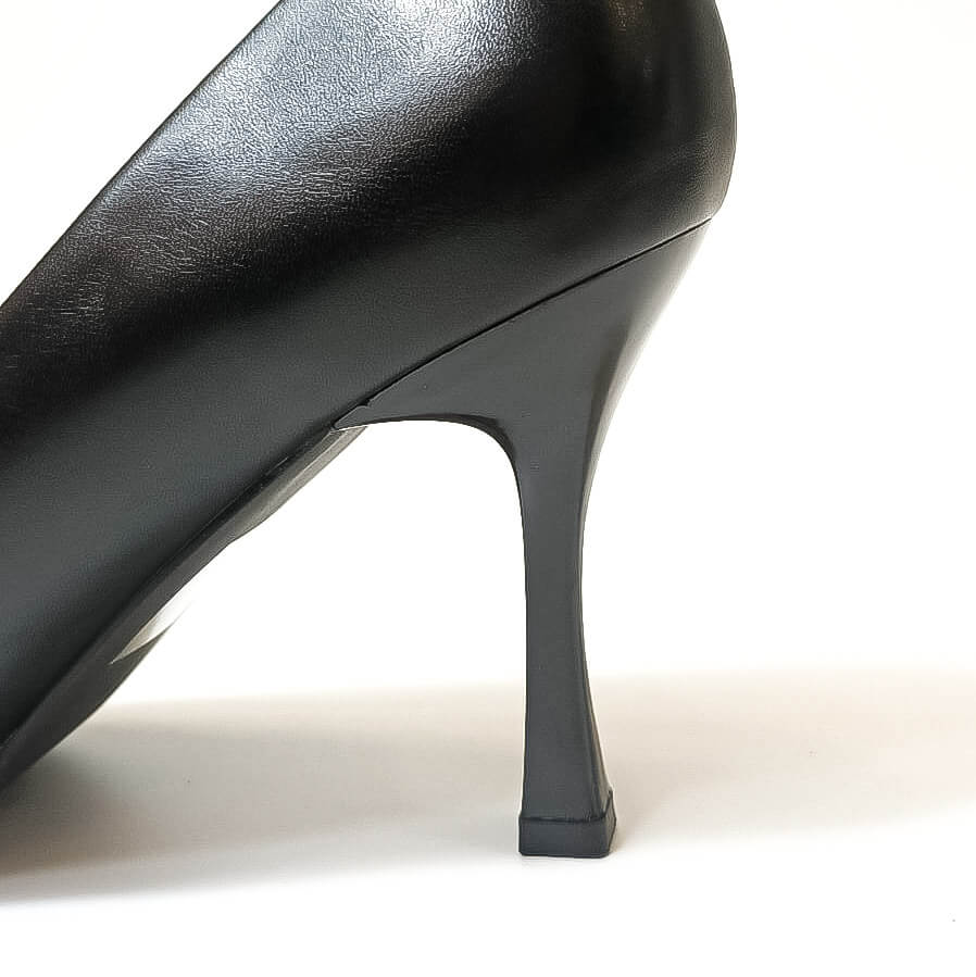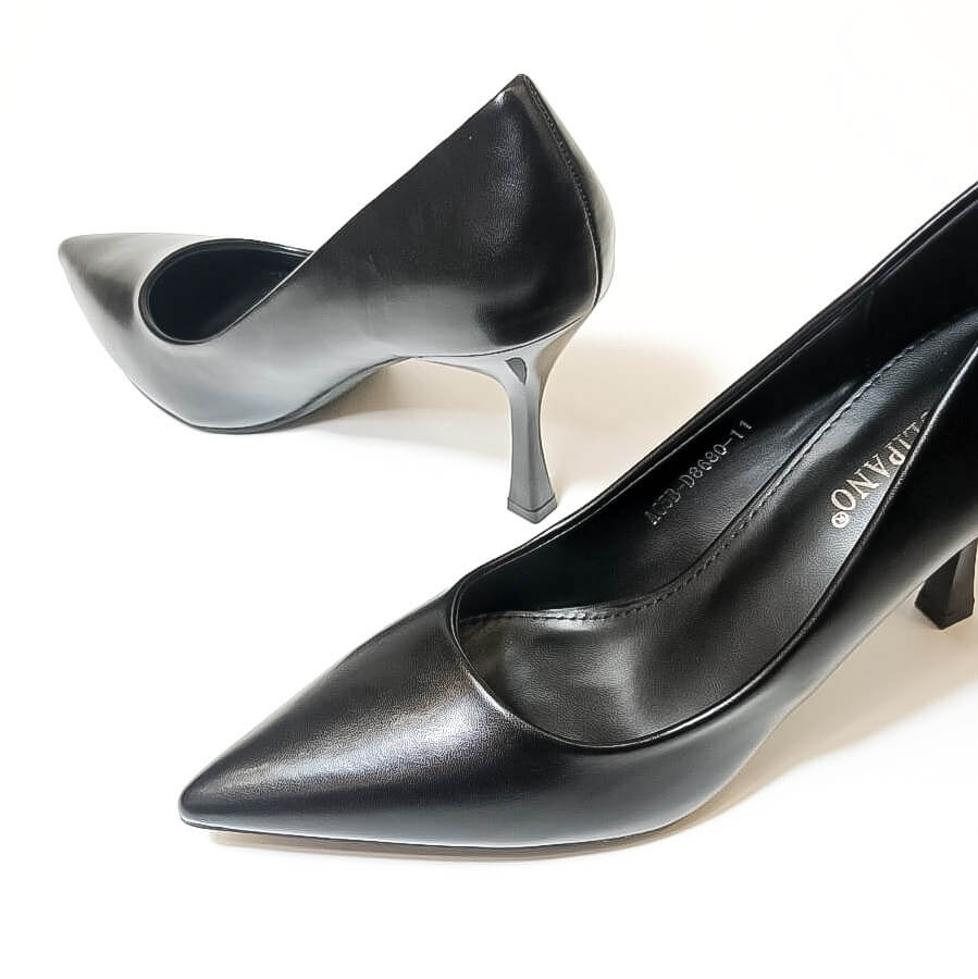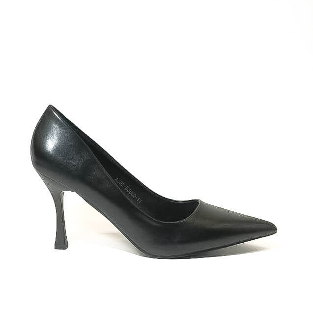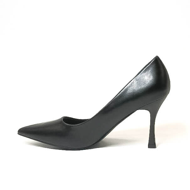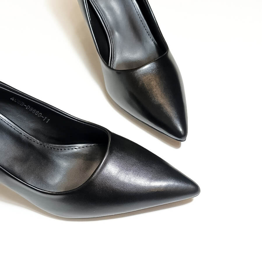 Γόβα μαύρη με λεπτό τακούνι, από οικολογικό δέρμα. Μυτερό τελείωμα. Το ύψος του τακουνιού είναι 8 εκ. Μια κομψή και στυλάτη επιλογή για πολλές περιστάσεις!