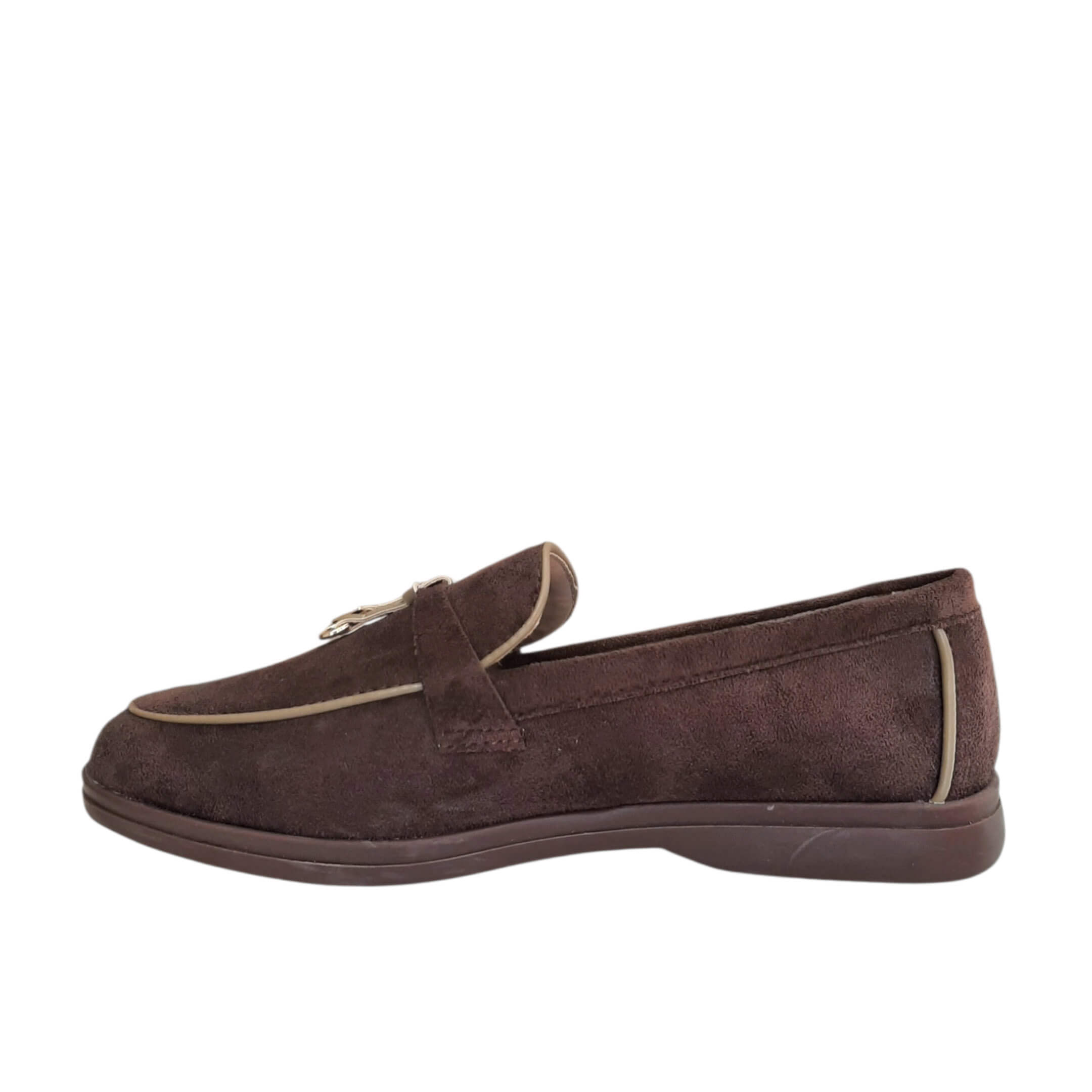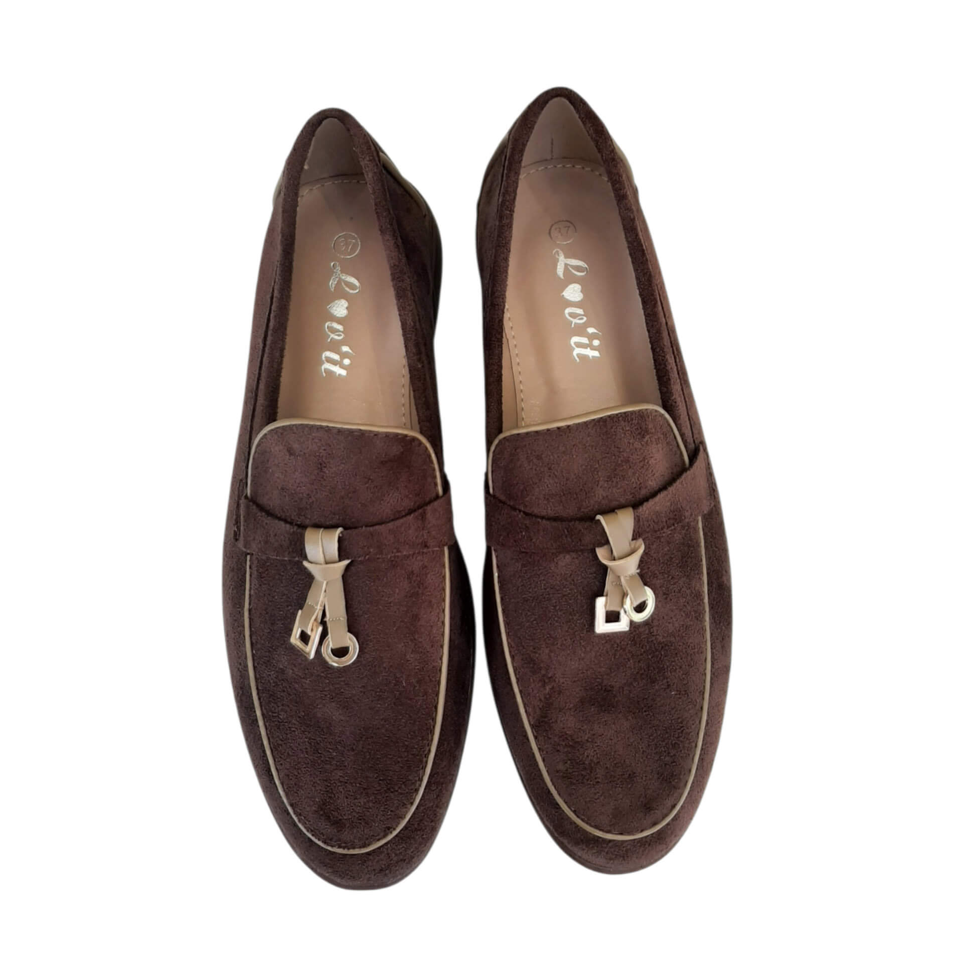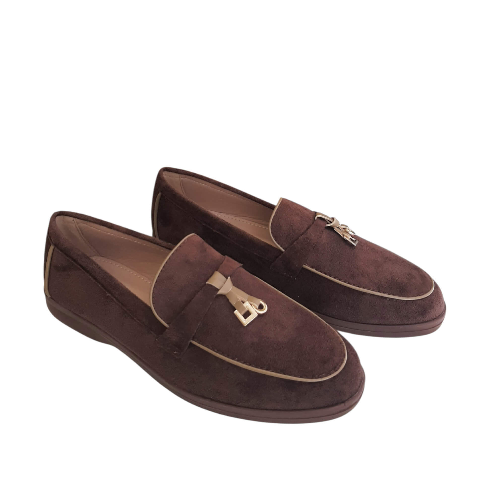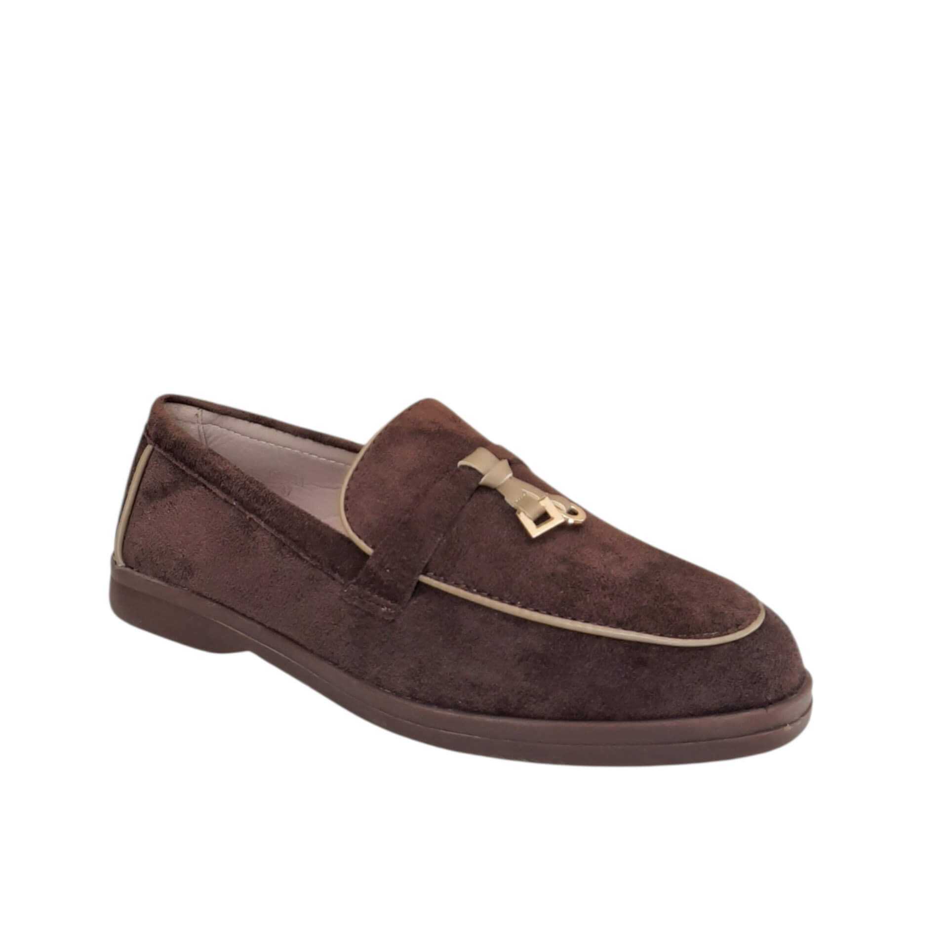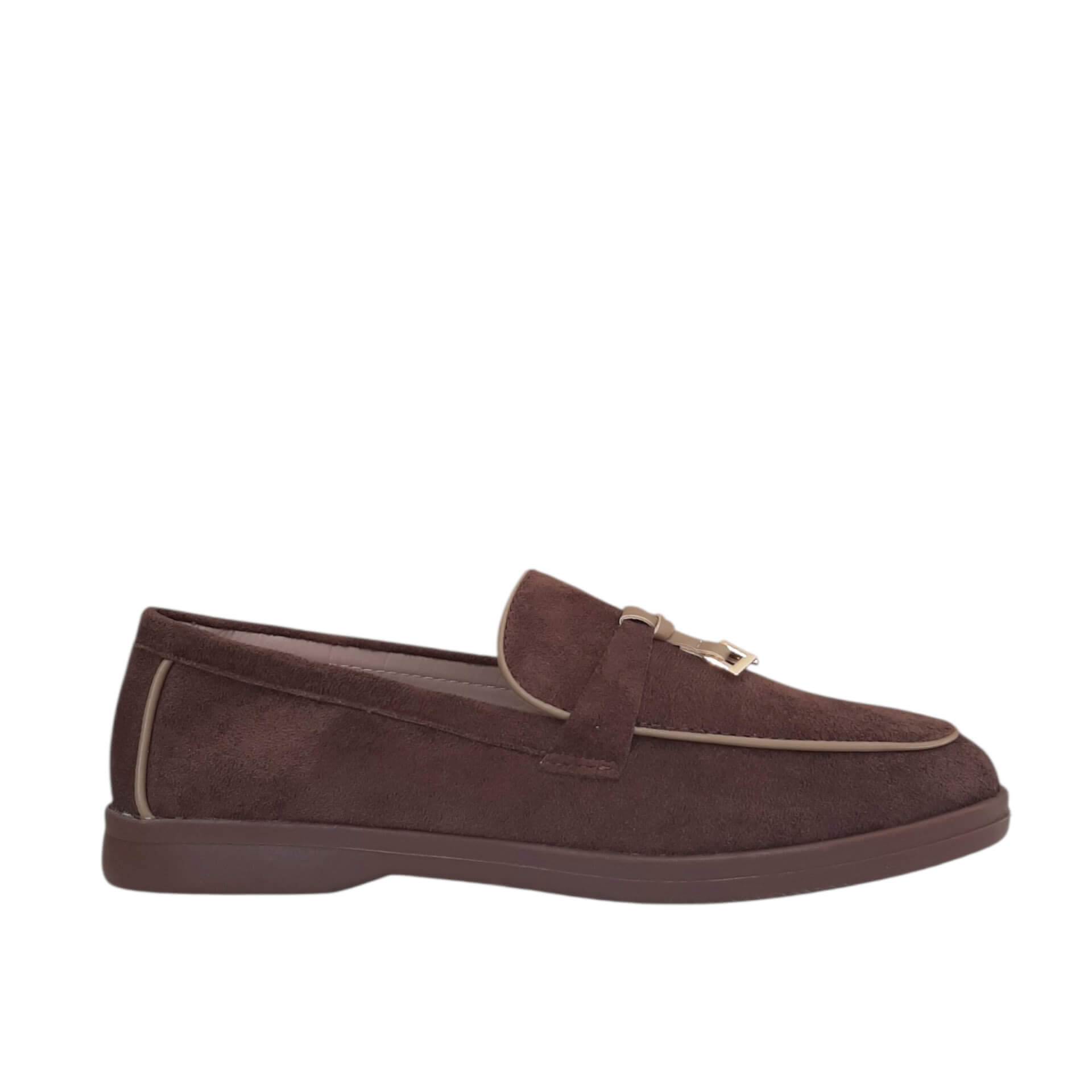 Μοκασίνια φλατ με εξώραφες λεπτομέρειες σε χρωματική αντίθεση και χρυσά διακοσμητικά στοιχεία στο πάνω μέρος. Είναι από οικολογικό δέρμα σε suede υφή, και το ύψος του τακουνιού είναι 2 εκ.