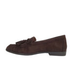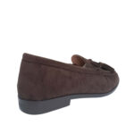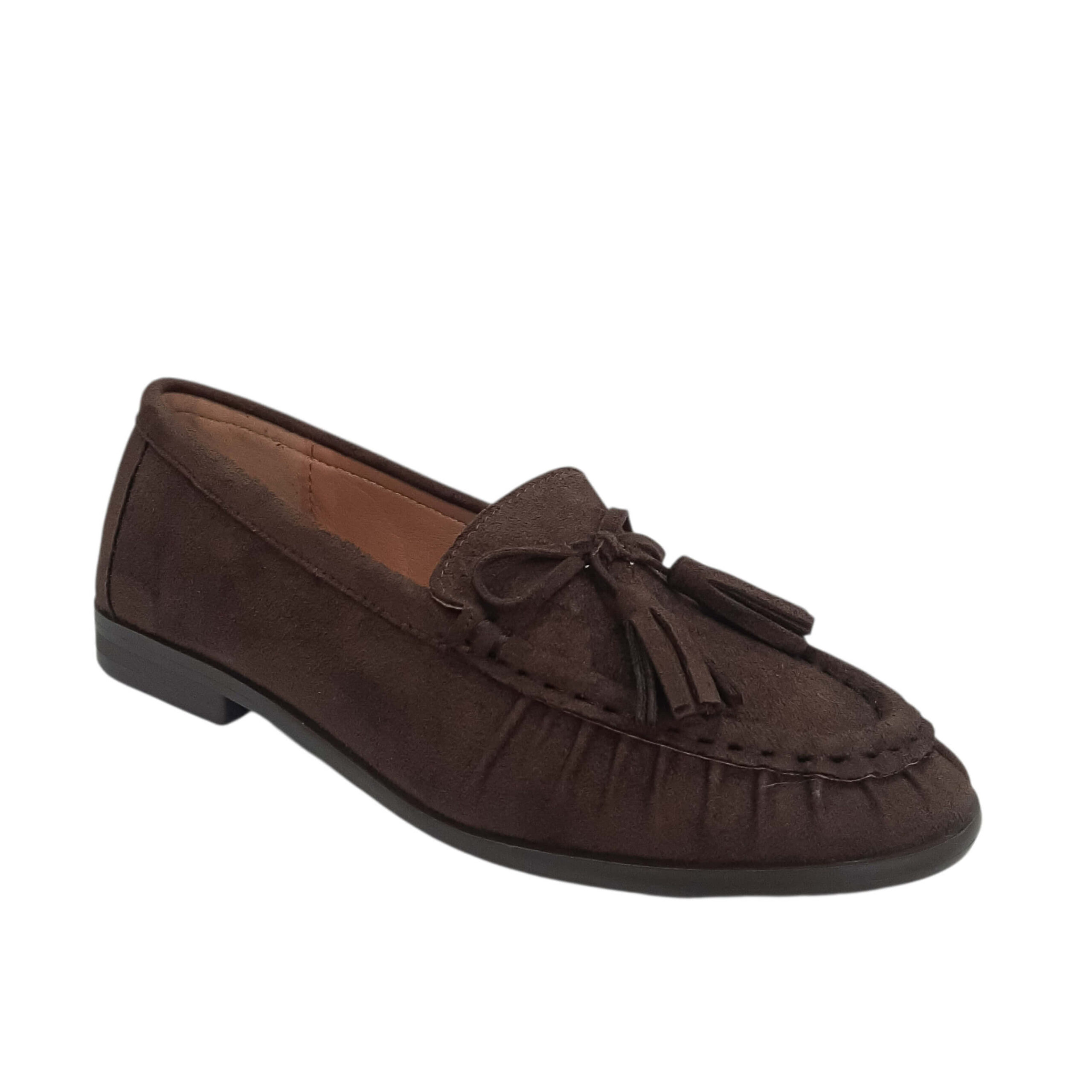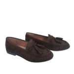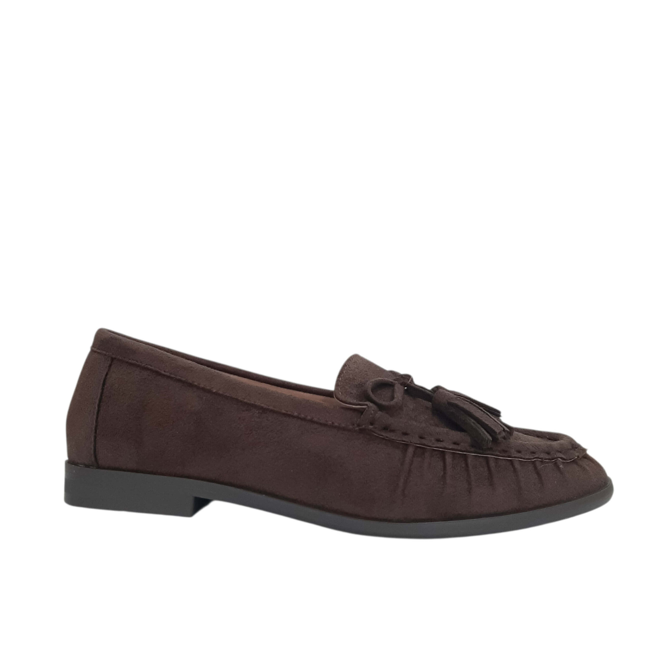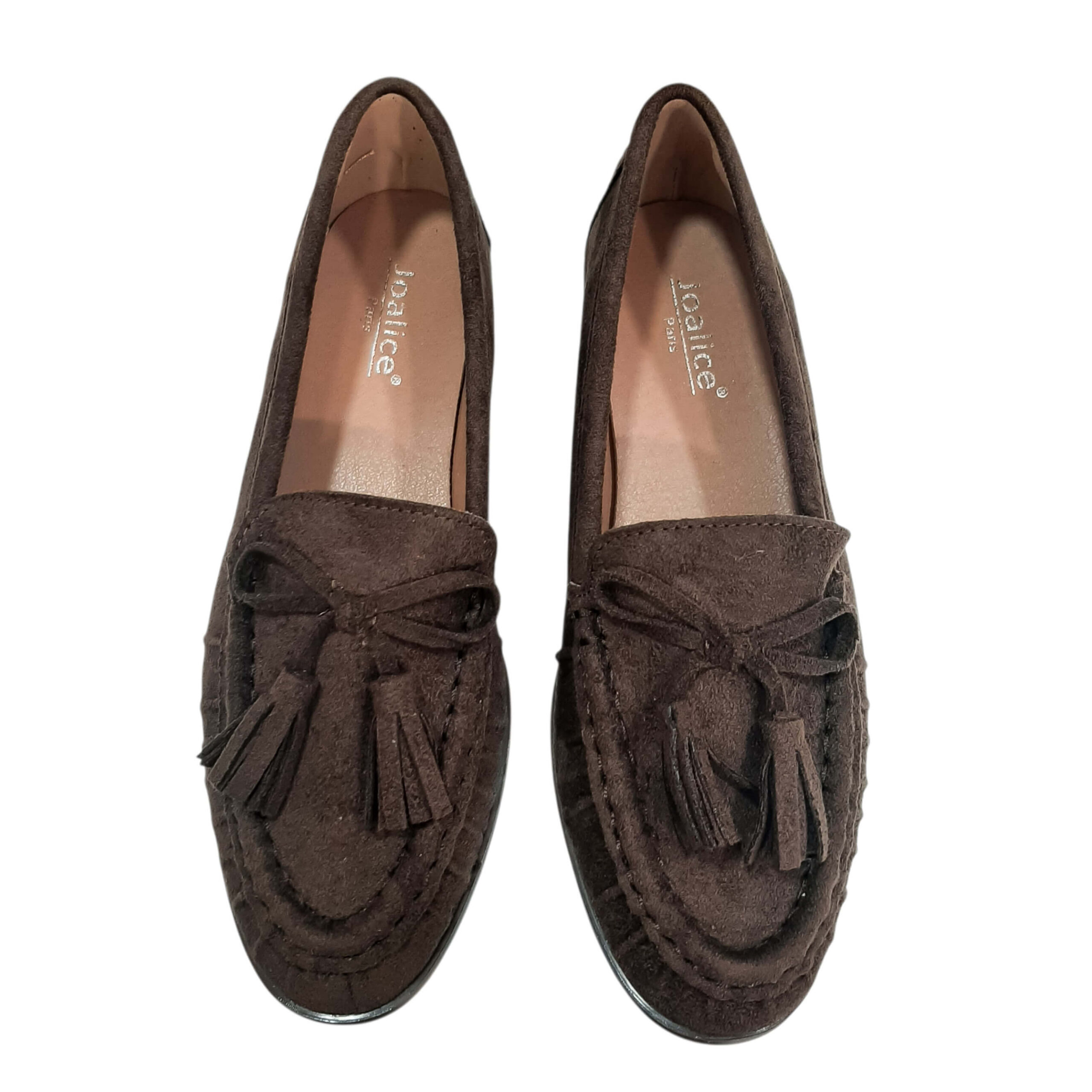 Μοκασίνια φλατ με εξώραφες λεπτομέρειες και διακοσμητικά φουντάκια στο πάνω μέρος. Είναι από οικολογικό δέρμα σε suede υφή, και το ύψος του τακουνιού είναι 2 εκ.