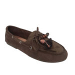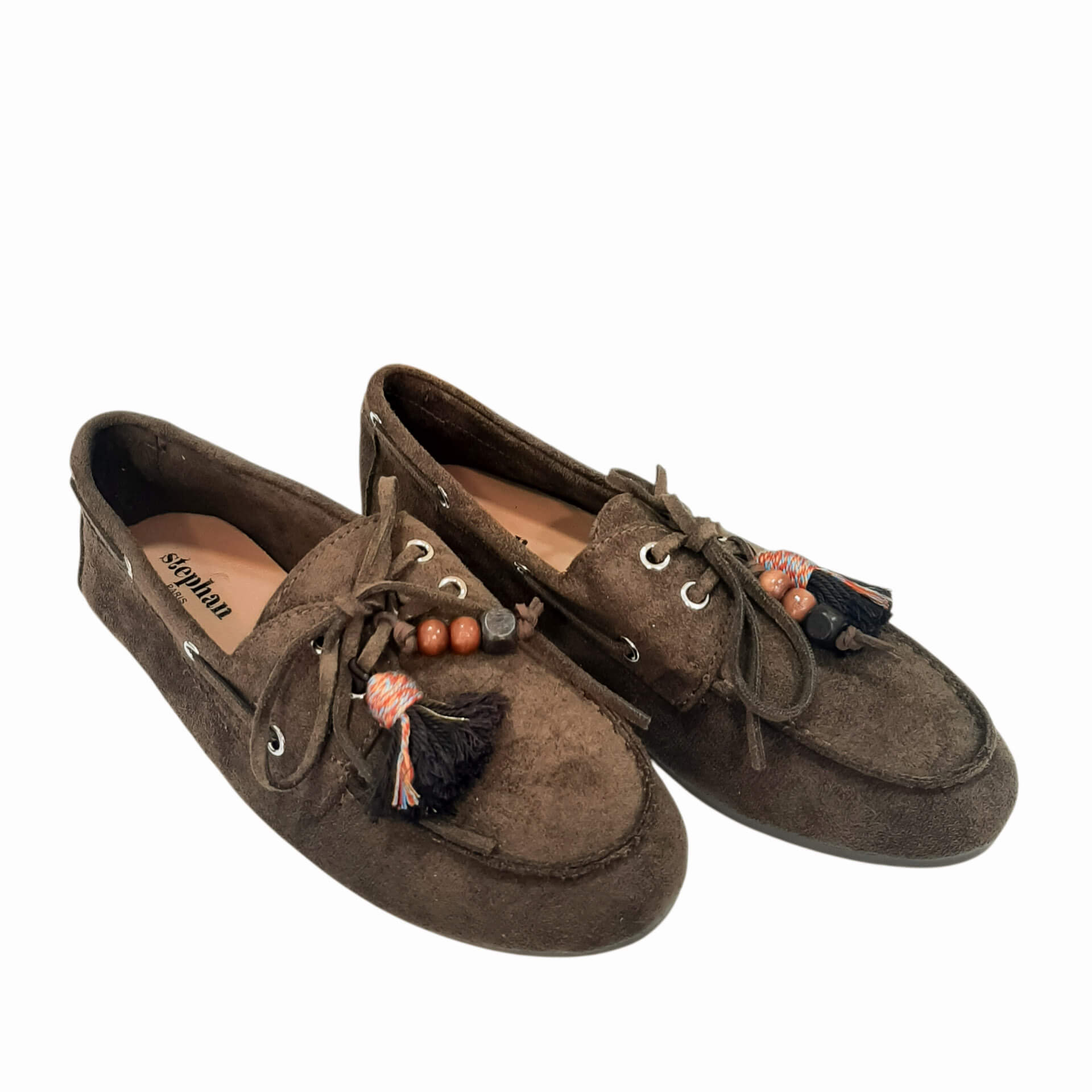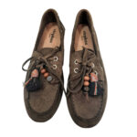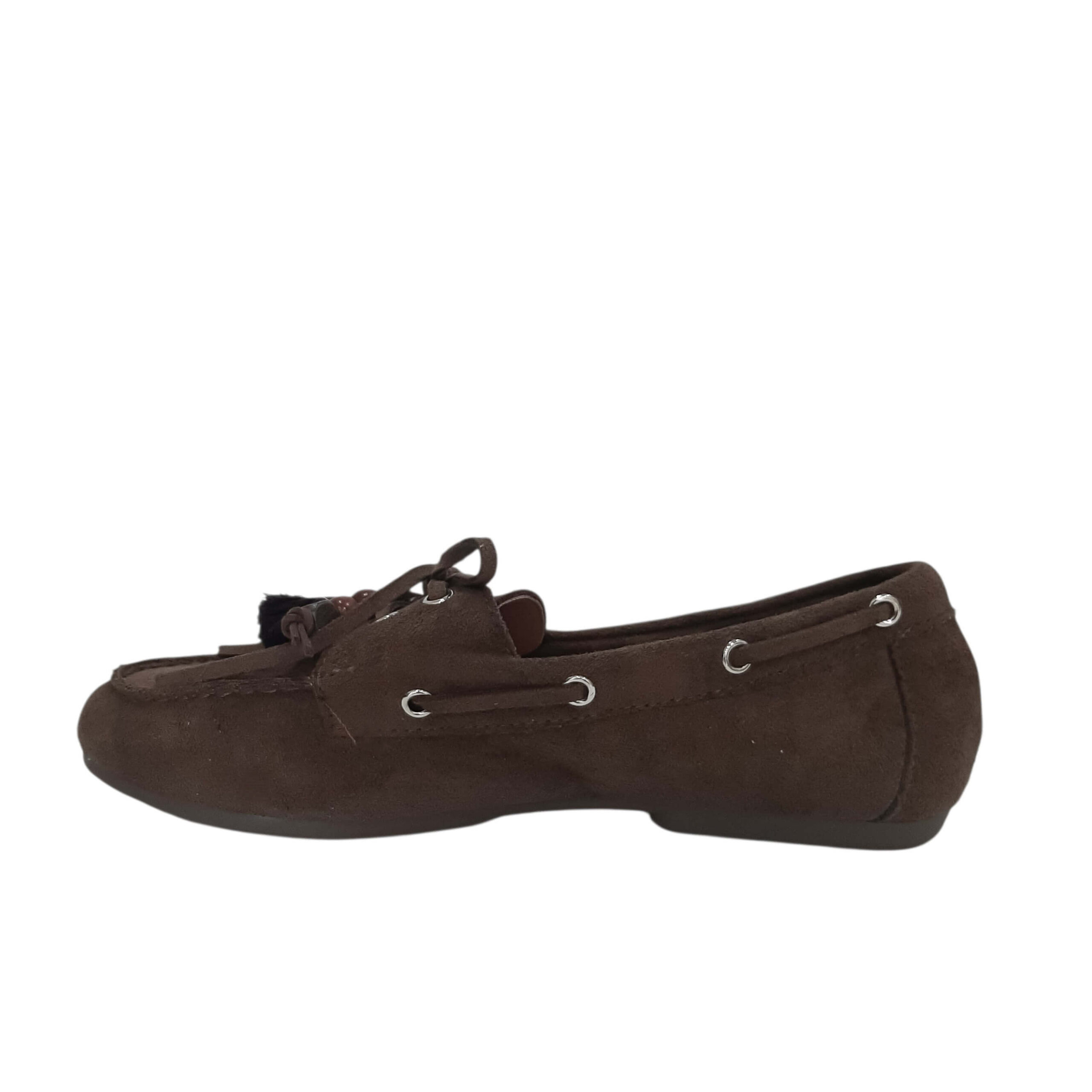 Μοκασίνια φλατ με εξώραφες λεπτομέρειες και διακοσμητικά στοιχεία στο πάνω μέρος. Δέσιμο με κορδόνι. Είναι από οικολογικό δέρμα σε suede υφή, και το ύψος του τακουνιού είναι 1 εκ.
