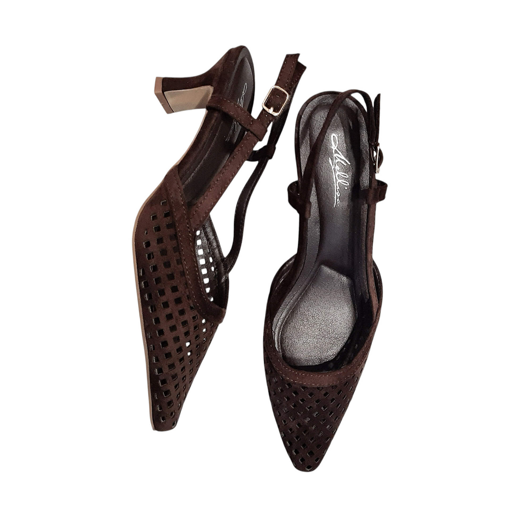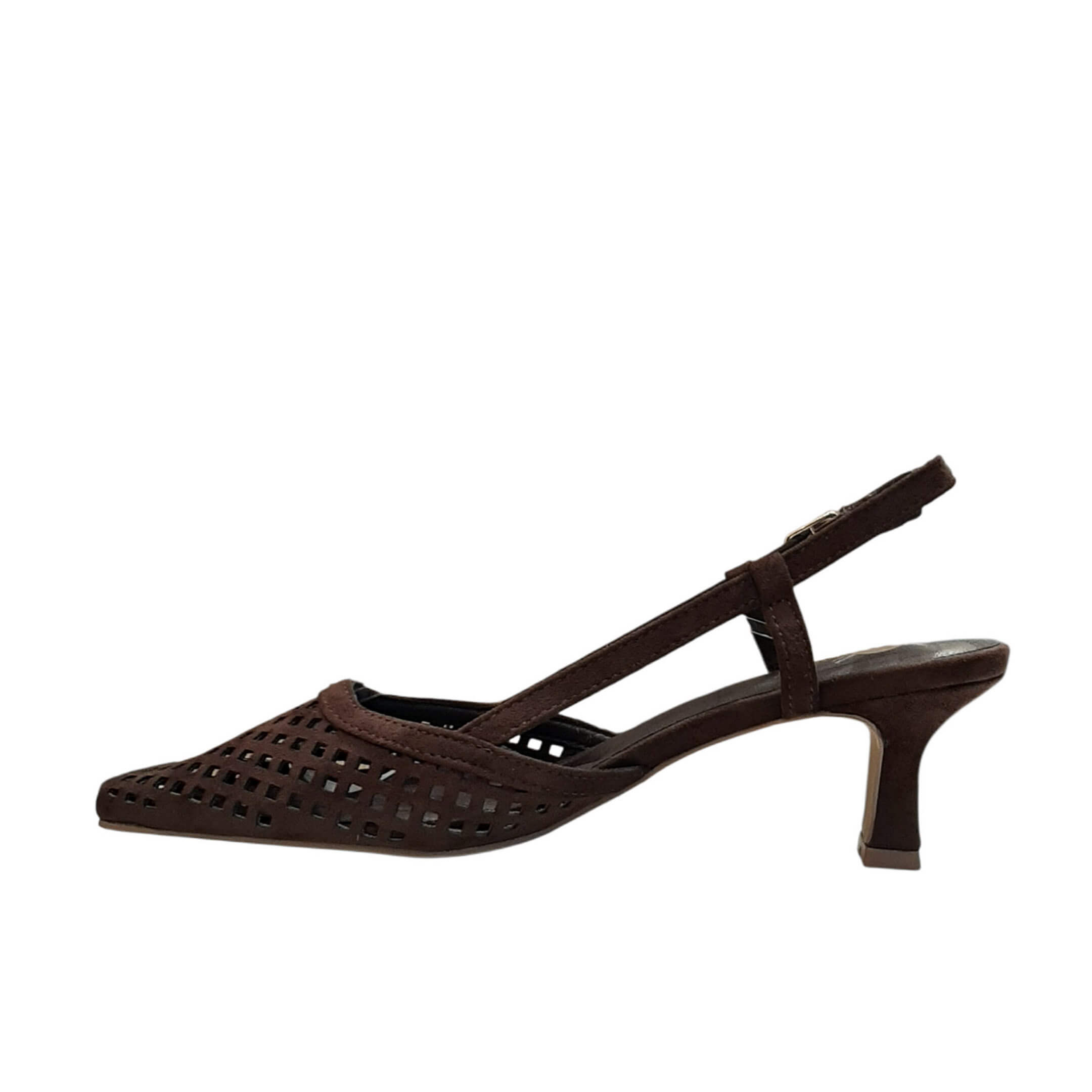 | Open heel γόβα με διάτρητο σχέδιο, σε σουέτ υφή. Κουμπώνει με λουράκι στον αστράγαλο. Έχει χαμηλό ιδιαίτερο τακούνι και το ύψος του είναι 6 εκ. Μια κομψή και στυλάτη επιλογή για πολλές περιστάσεις! |