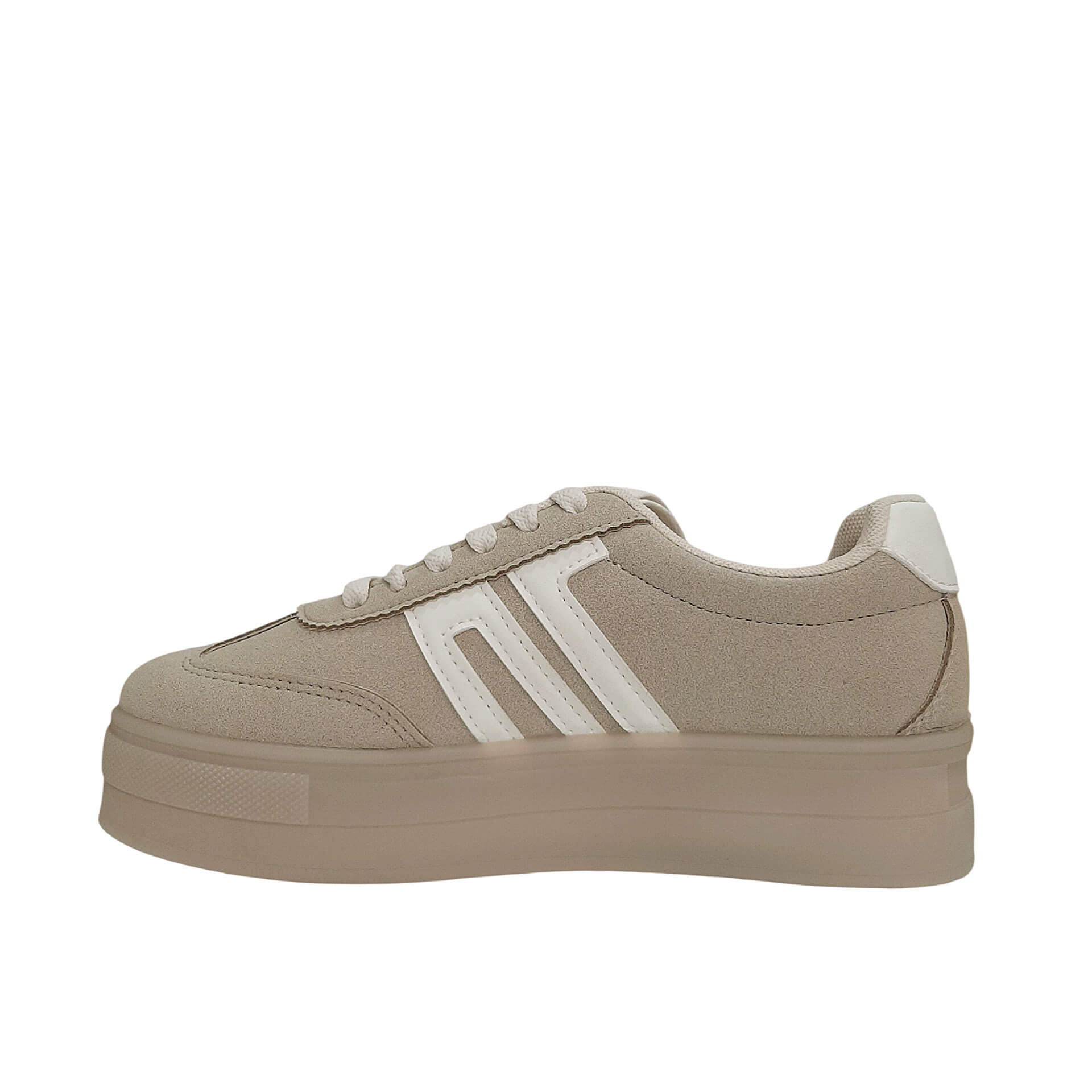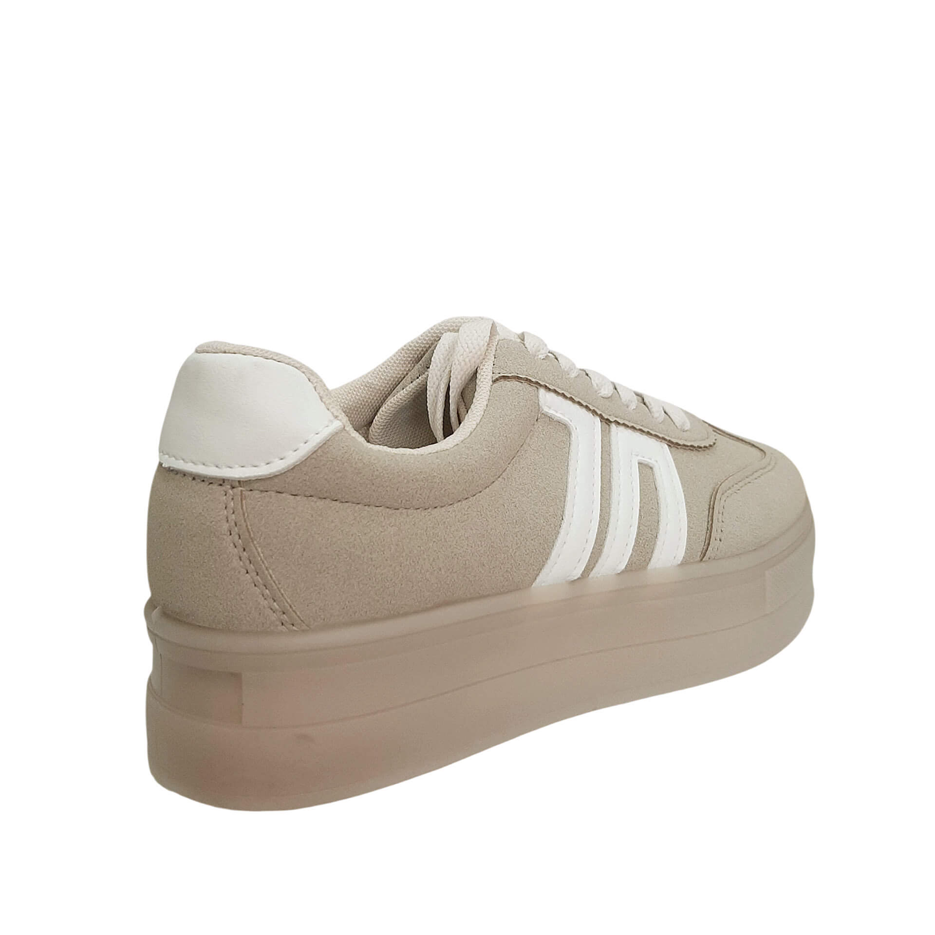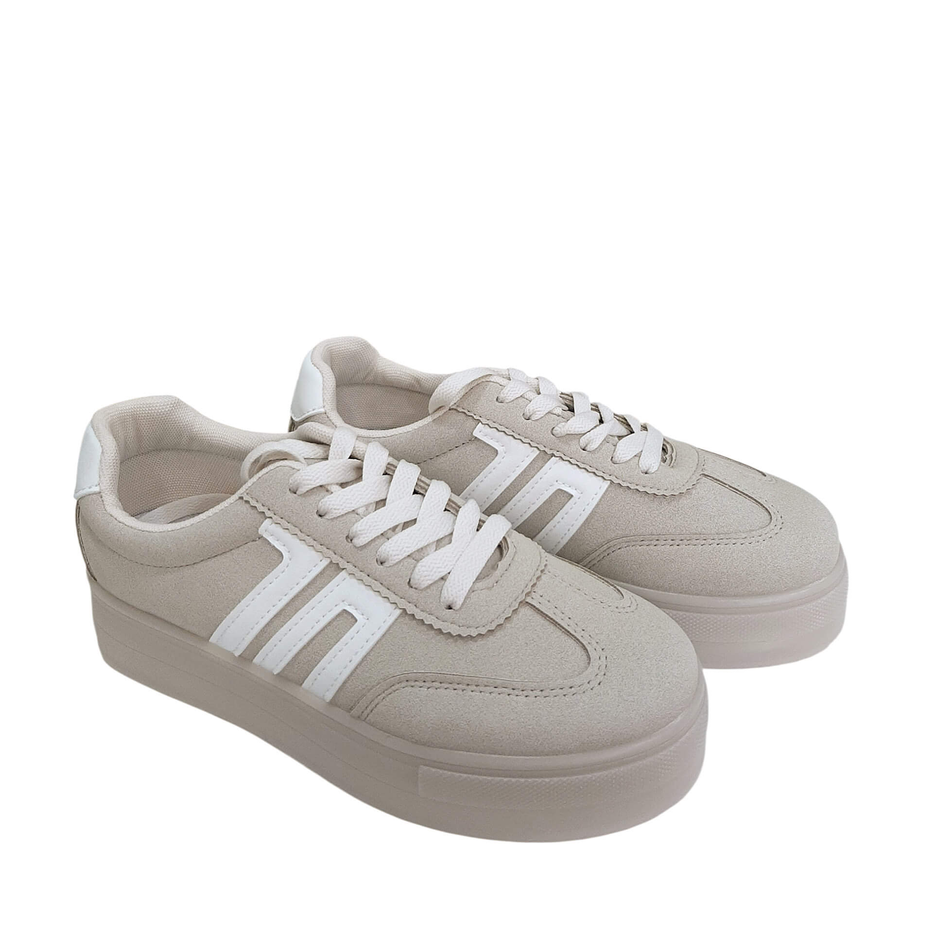 | Sneakers δίσολα με χρωματικό συνδυασμό σε μπεζ αποχρώσεις. Είναι από οικολογικό δέρμα σε suede υφή. Κλείσιμο με κορδόνια. Το ύψος τους είναι 4 εκ. |