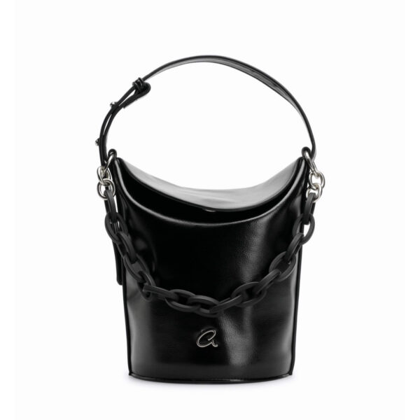 Deryn γυναικεία τσάντα χειρός τύπου bucket, κατασκευασμένη από τεχνόδερμα υψηλής ποιότητας. Μπορεί να κρατηθεί από την αλυσίδα που διαθέτει, να φορεθεί ως χιαστί με το αποσπώμενο λουράκι που περιέχει ή και να φορεθεί στον ώμο προσαρμόζοντας το χερούλι της. Εσωτερικά έχει φόδρα και μικρή θήκη. Μία ιδιαίτερη τσάντα για ξεχωριστές εμφανίσεις.