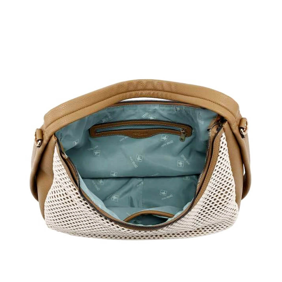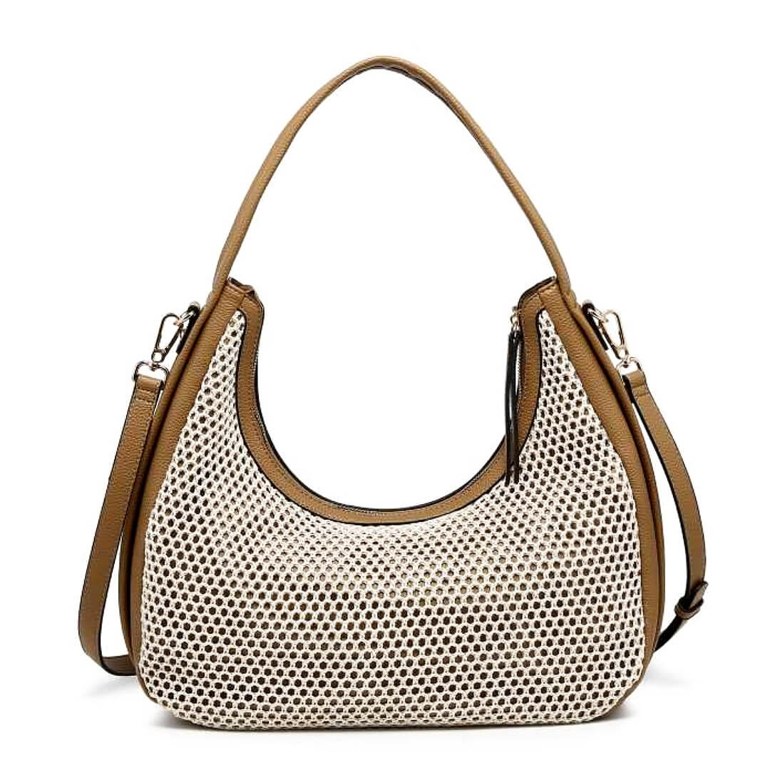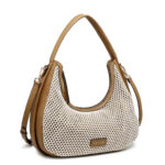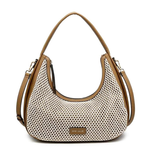 Τσάντα ώμου από την Pepe Moll, κατασκευασμένη από πλέγμα raffia πάνω από λινάτσα. Αυτό το μοντέλο διαθέτει κλείσιμο με φερμουάρ στο πάνω μέρος και δύο λαβές: μία κοντή για μεταφορά στο χέρι ή στο μπράτσο και 1 μακρύ ρυθμιζόμενο και αφαιρούμενο λουράκι για να φοριέται ως τσάντα χιαστί. Στο εσωτερικό υπάρχουν δύο τσέπες για την αποθήκευση μικρότερων αντικειμένων. Το σχήμα ημισέληνου προσθέτει μια εκλεπτυσμένη πινελιά, καθιστώντας την ιδανική για κάθε καλοκαιρινή εμφάνιση.